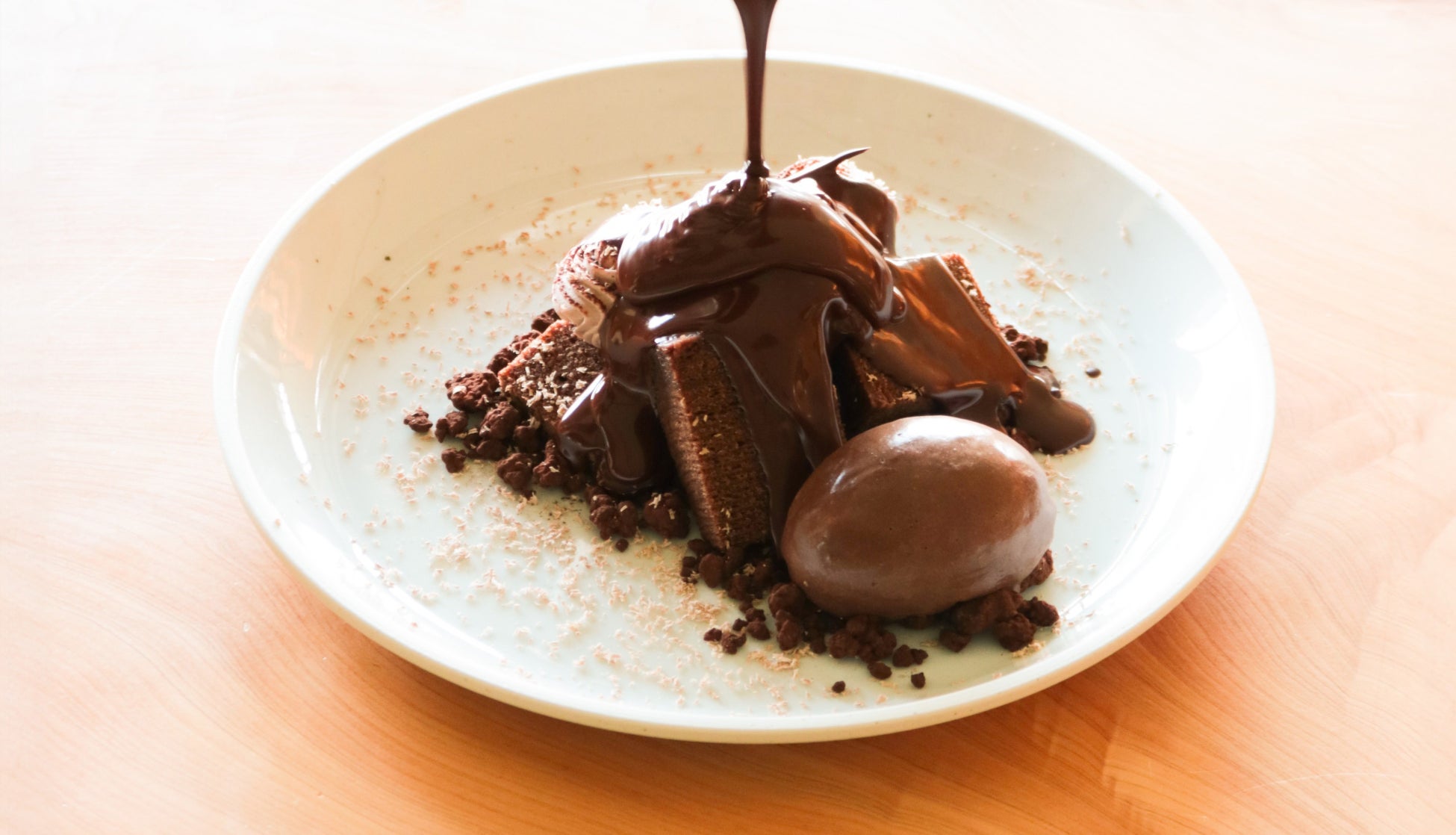 「ショコラばあむ」をベースに、くちどけの異なる2種類のチョコレートクリーム、コーティングされたクッキー、ショコラジェラートを散りばめました。添えたホットショコラをかけていただく、ショコラづくしのばあむプレートです。