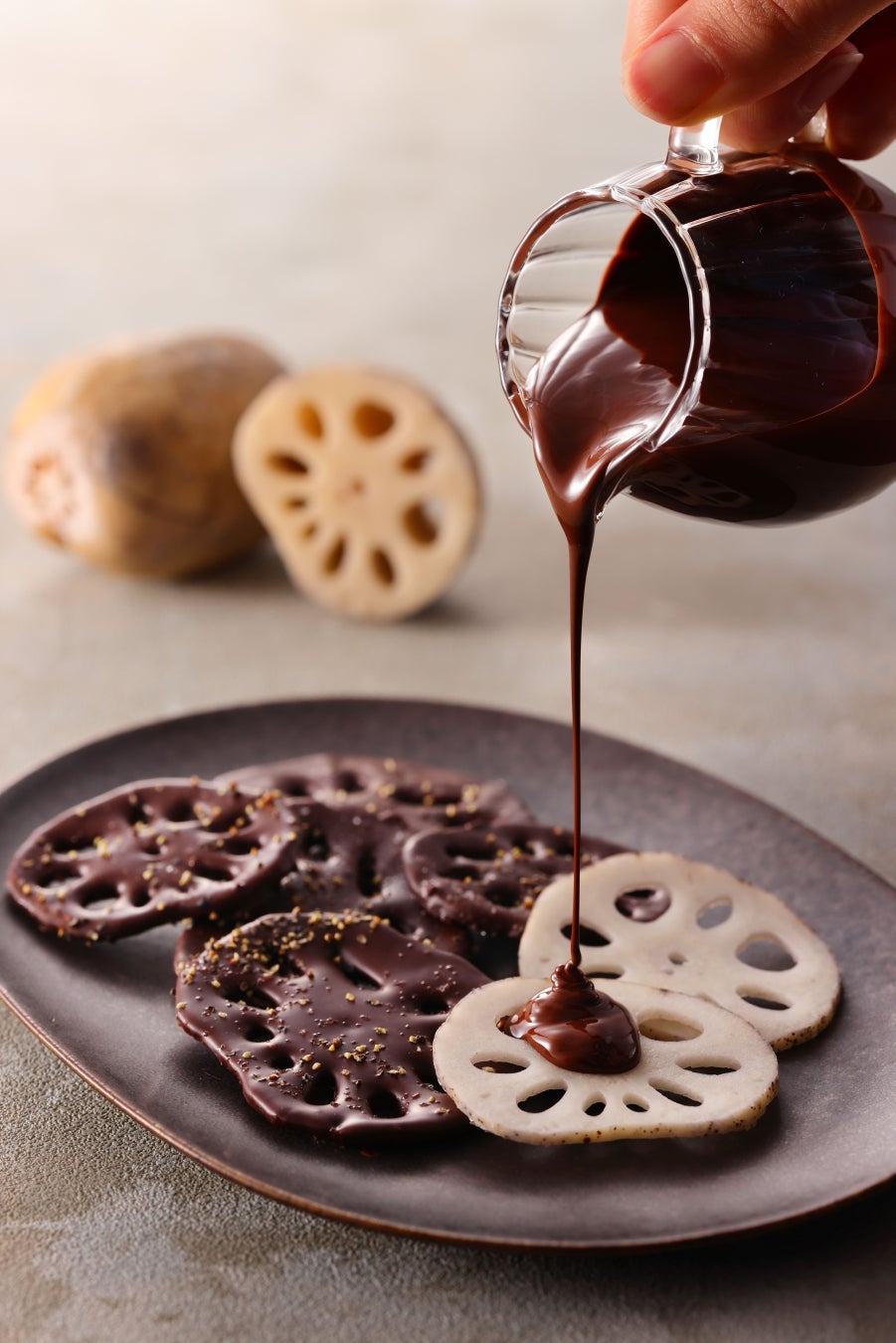 れんこんをたっぷりと蜜に浸し、ビターチョコレートをコーティング。サクッとした心地の良い食感と、滲み出る甘さがチョコレートと溶け合い、ピリッと効く塩コショウが斬新な一品です。