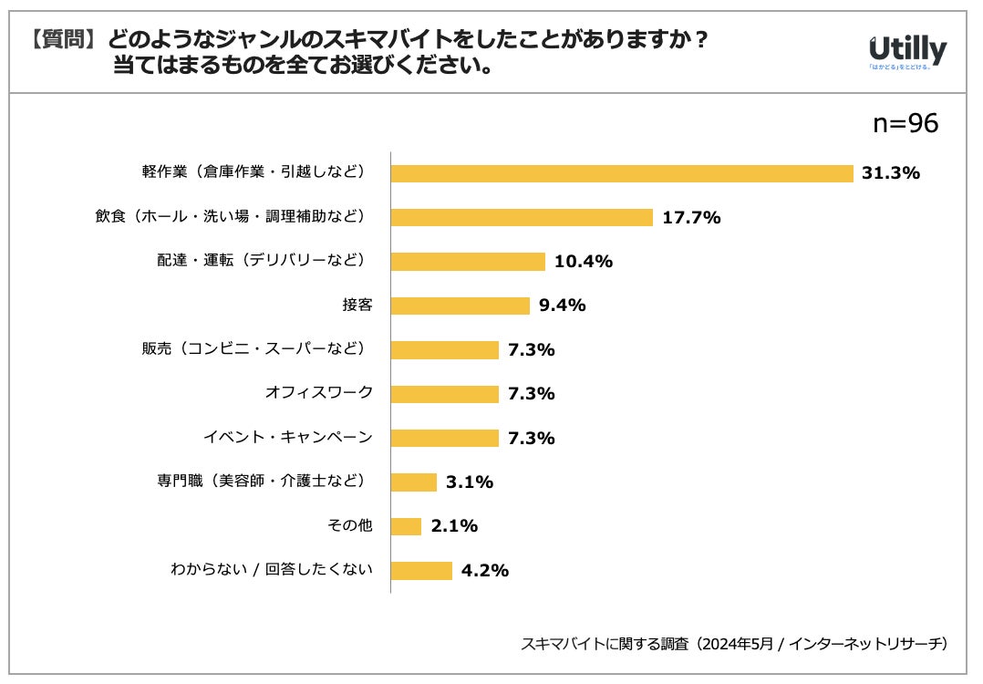 経験のあるスキマバイトのジャンルとしては『軽作業』が最も多い結果となった。