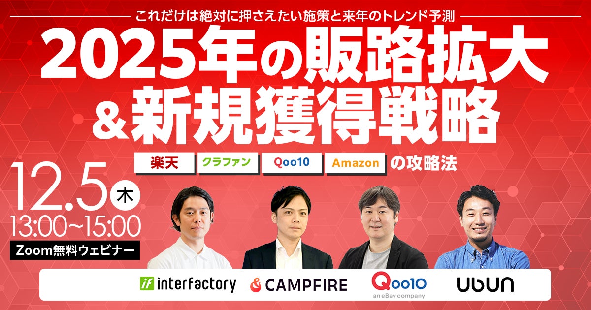 Amazonに特化したマーケティング・テクノロジー・ファイナンスによって、ECブランドの成長を実現するグロースパートナー株式会社ウブン(本社:東京都港区、代表取締役社長:森岡健太郎)は、2024年12月5日(木)に開催される株式会社インターファクトリー(本社:東京都千代田区、代表取締役:蕪木 登)主催の「これだけは絶対に押さえたい施策と来年のトレンド予測 2025年の販路拡大&新規獲得戦略 ~楽天・クラファン・Qoo10・Amazonの攻略法~」に登壇することが決定しました。当社は「リテールメディアとしてのAmazonと自社ECの共存戦略を解説」をテーマに登壇します。ぜひ、ご参加ください。