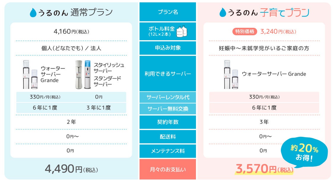 「毎日頑張るプレママ、ママに、ウォーターサーバーをもっと身近に感じてほしい!」「ウォーターサーバーがあることで少しでも毎日に余裕ができてほしい!」という思いから生まれたこのプランは、500mlに換算すると約68円と、家計に優しいのが特徴です。