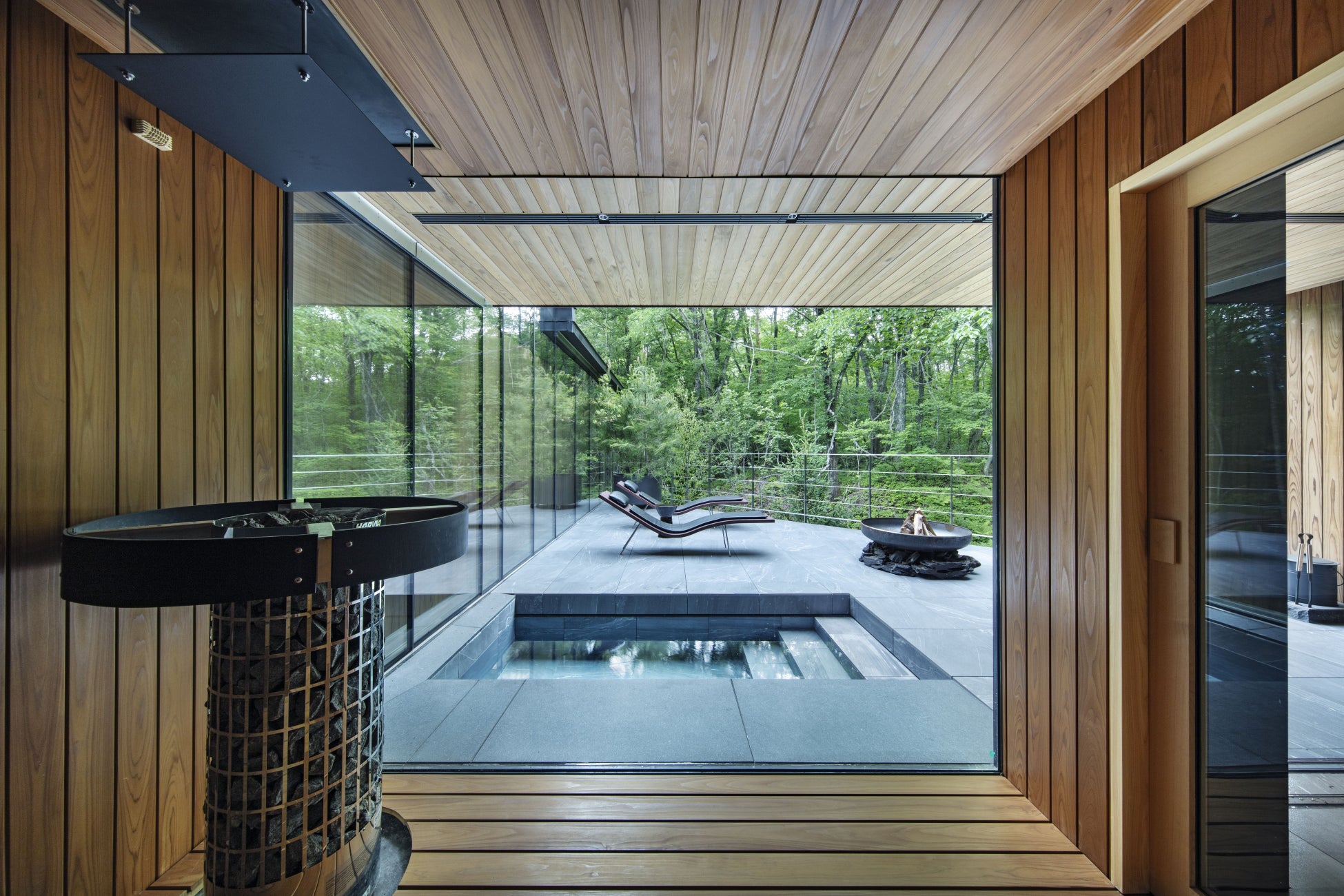 ガラス張りで外の景色を楽しみながら入ることのできるサウナ。直結するテラスでは、大自然を眺めながら水風呂や外気浴を堪能でき、身も心もリラックスできます。