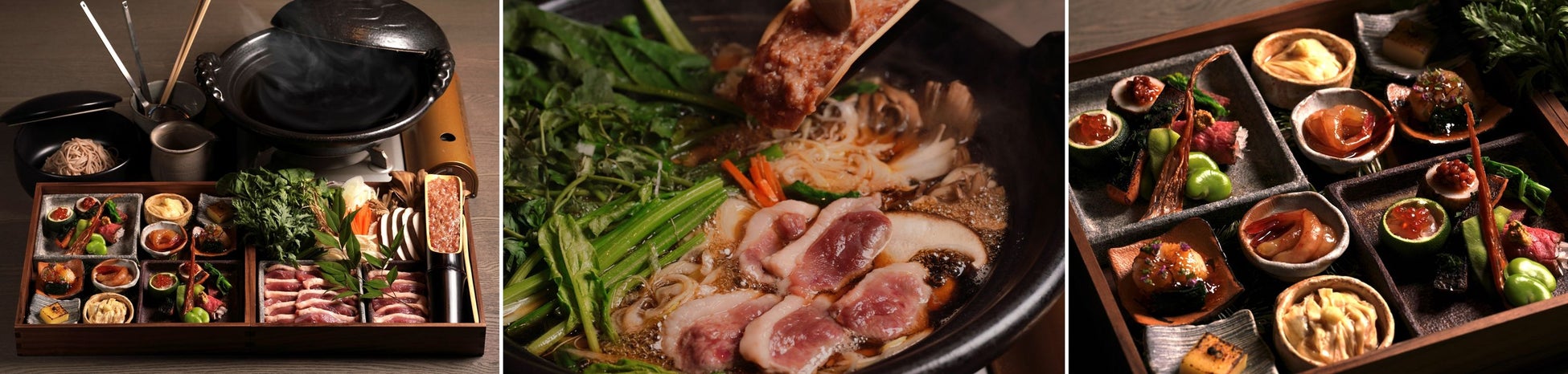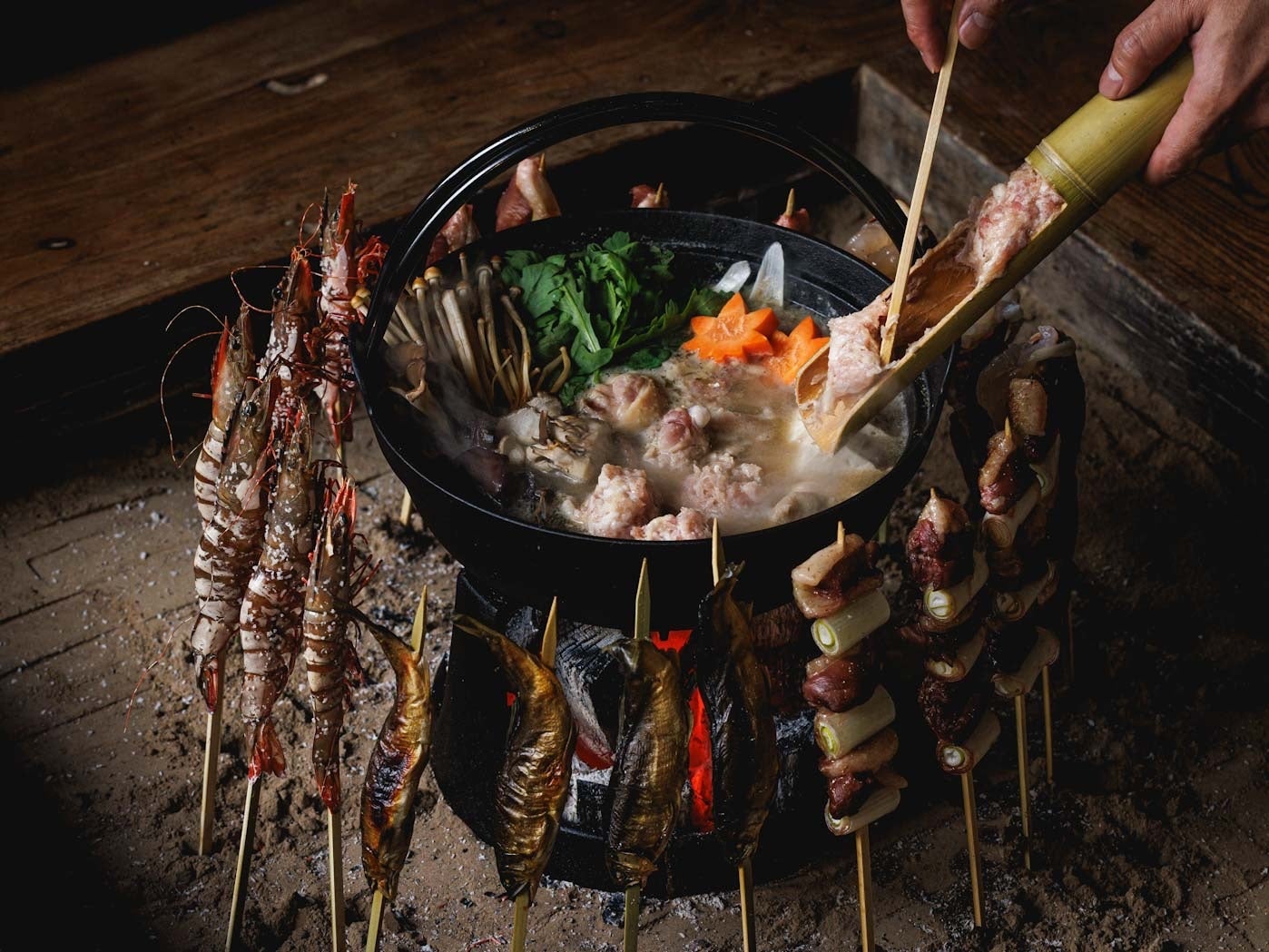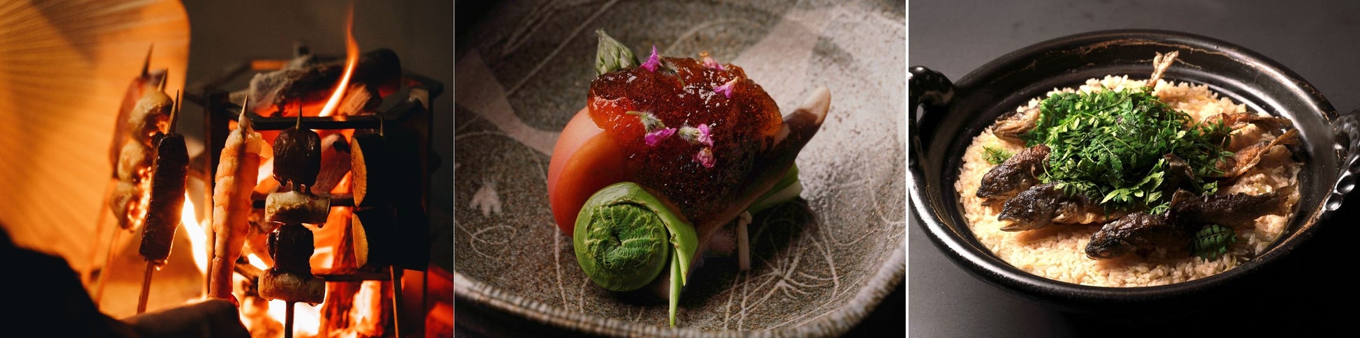 敷地内には宿泊者のみが利用できる、北軽井沢の風景を眺めながら朝食やディナーを愉しめるエクスクルーシブなレストランがあります。シェフが北軽井沢ならではの味覚を活かした囲炉裏料理を提供するプライベートな空間です。カウンターで炭火で調理される川魚、牛肉、ジビエなどをお楽しみください。また、お部屋ではBBQや鶏白湯鍋、鴨鍋もお楽しみいただけます。