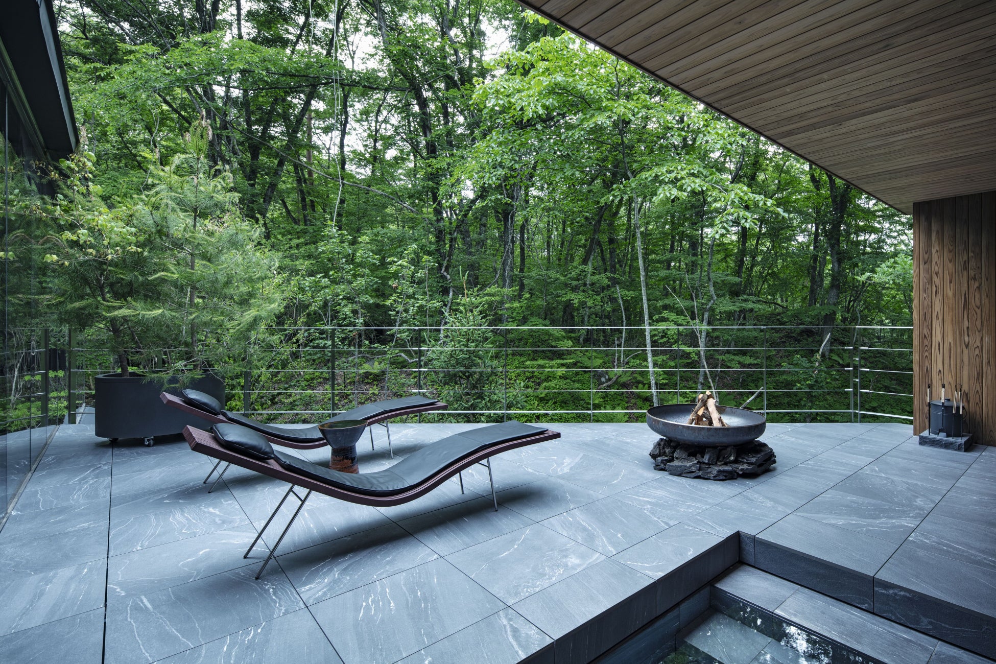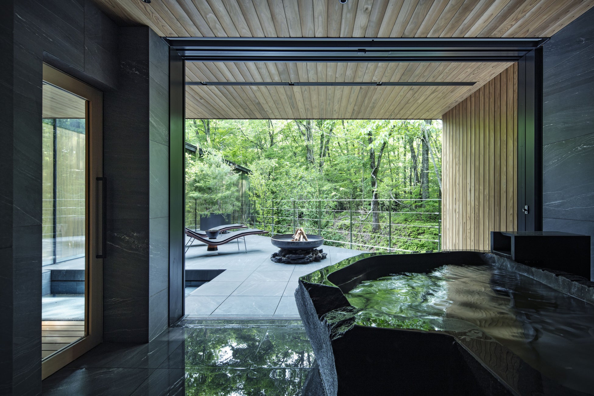 扉を開けばテラスと直結する半露天風呂。春や夏はもちろん、雪が深々と降り積もる北軽井沢の冬にあっても、しっかりと暖まることができる天然温泉。巨大な岩を削り出した一点物の岩風呂も所有欲を満たします。