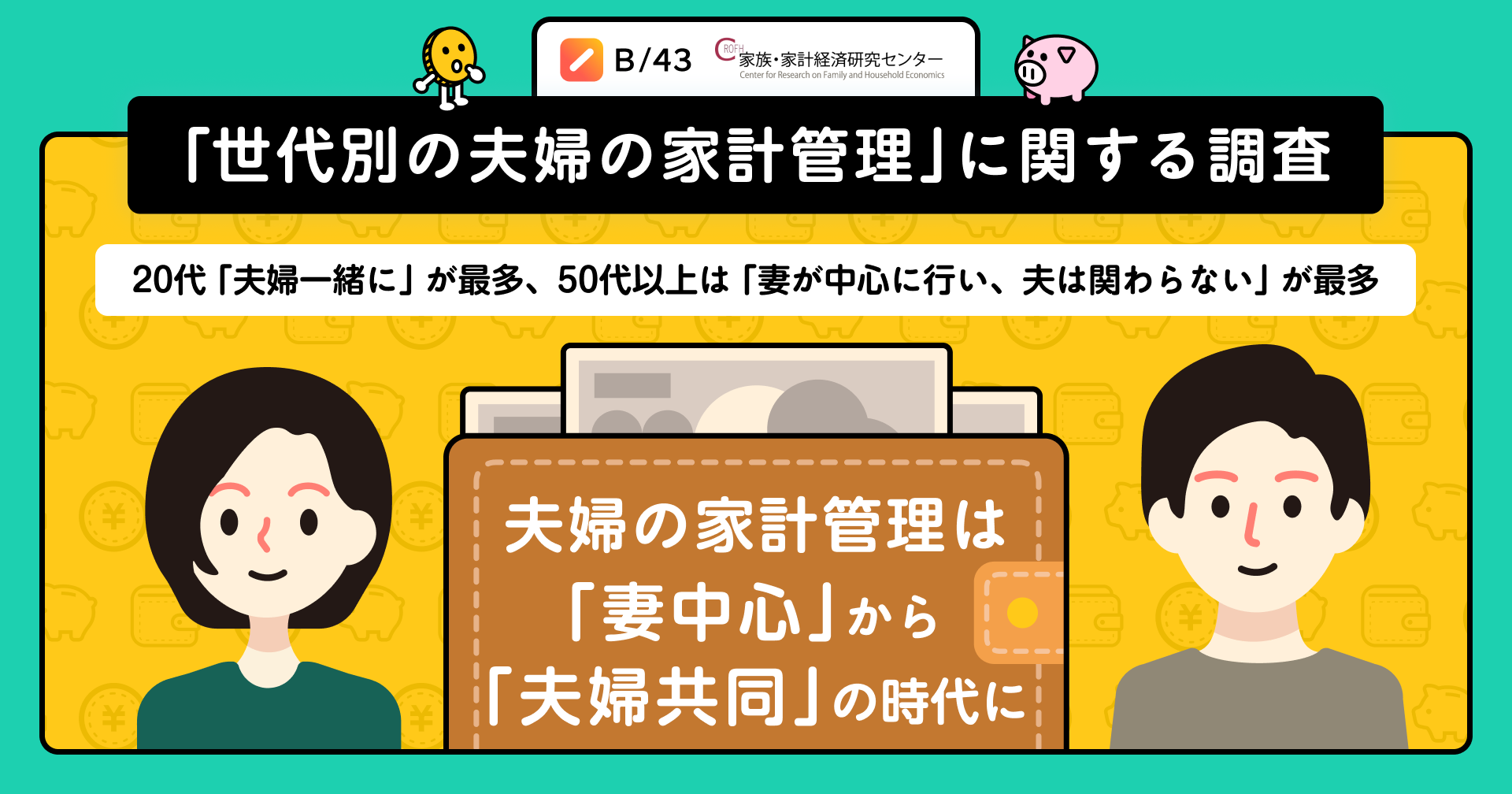 夫婦の家計管理は「妻中心」から「夫婦共同」の時代に。50代以上は「妻が中心に行い、夫は関わらない」が最多。20代は「夫婦一緒に」が最多で「妻が中心に行い、夫は関わらない」は50代と比べ28.3pt低い