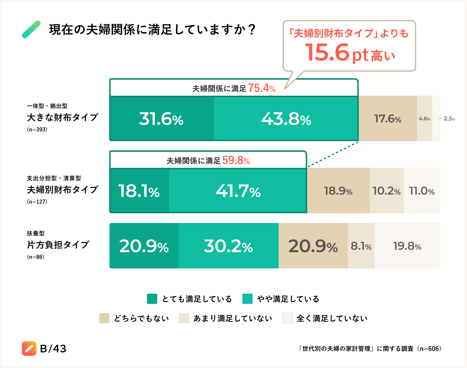 現在の夫婦関係に対する満足度を、「収入持ち寄りタイプ」・「夫婦別財布タイプ」別にみると、「夫婦関係に満足」と回答したのは「収入持ち寄りタイプ」の夫婦では75.4%となりました。一方、「夫婦別財布タイプ」の夫婦は59.8%となり、「夫婦関係に満足」と回答する割合は「収入持ち寄りタイプ」の夫婦の方が15.6ポイント高いことがわかりました。