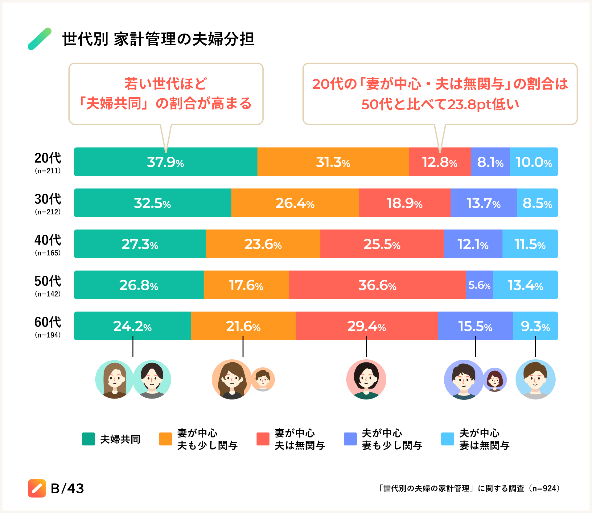「夫婦共同」で家計管理する夫婦の割合を年代別に見ると、20代では37.9%、30代では32.5%、40代では27.3%、50代では26.8%、60代では24.2%となり、若い世代ほど「夫婦共同」で家計管理する割合が高まることがわかりました。