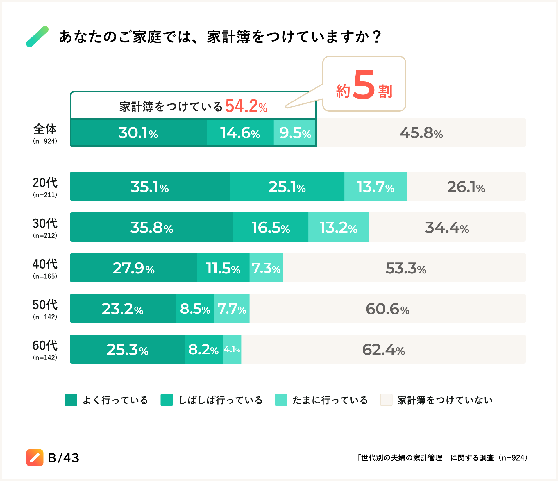 ~ 54.2%が家計簿をつけていると回答。20代〜30代では過半数、40代以上では半数未満〜