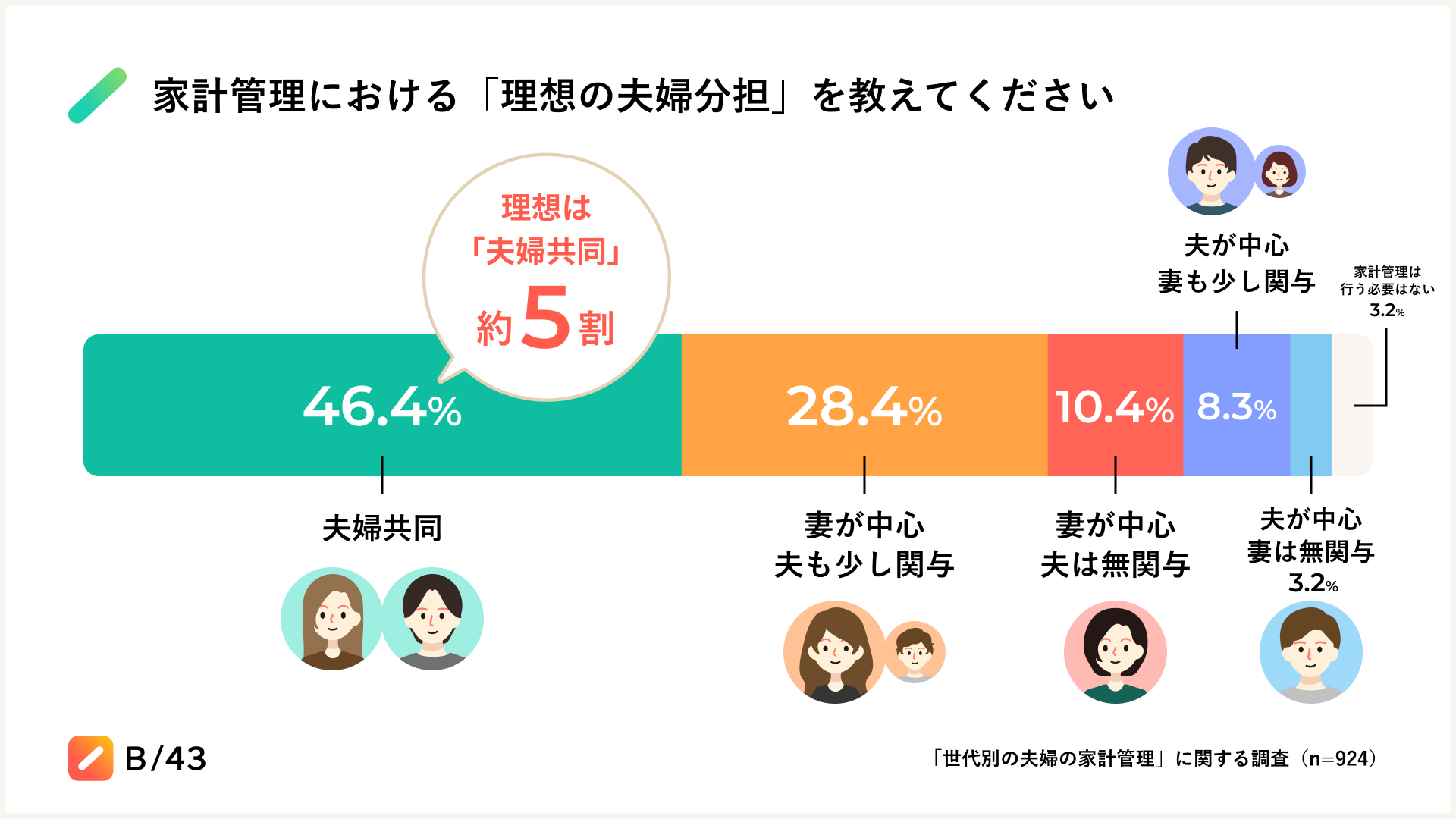 家計管理における夫婦分担の理想は、夫婦がともに行う「夫婦共同」が最多