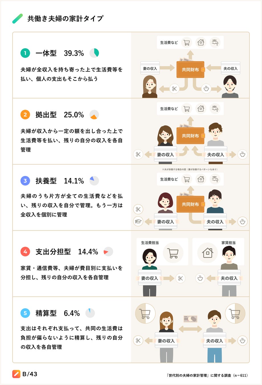 ~ 夫婦の全収入を持ち寄り家族のお金とする「一体型」が39.3%、夫婦ともに収入の一部を持ち寄り家族のお金とする「拠出型」が25.0%、支出毎に夫婦で分担する「支出分担型」14.4%、夫婦のどちらかが全ての生活費を負担する「扶養型」が14.1%、各自支払いをした上で負担が偏らないよう精算する「精算型」6.4%~