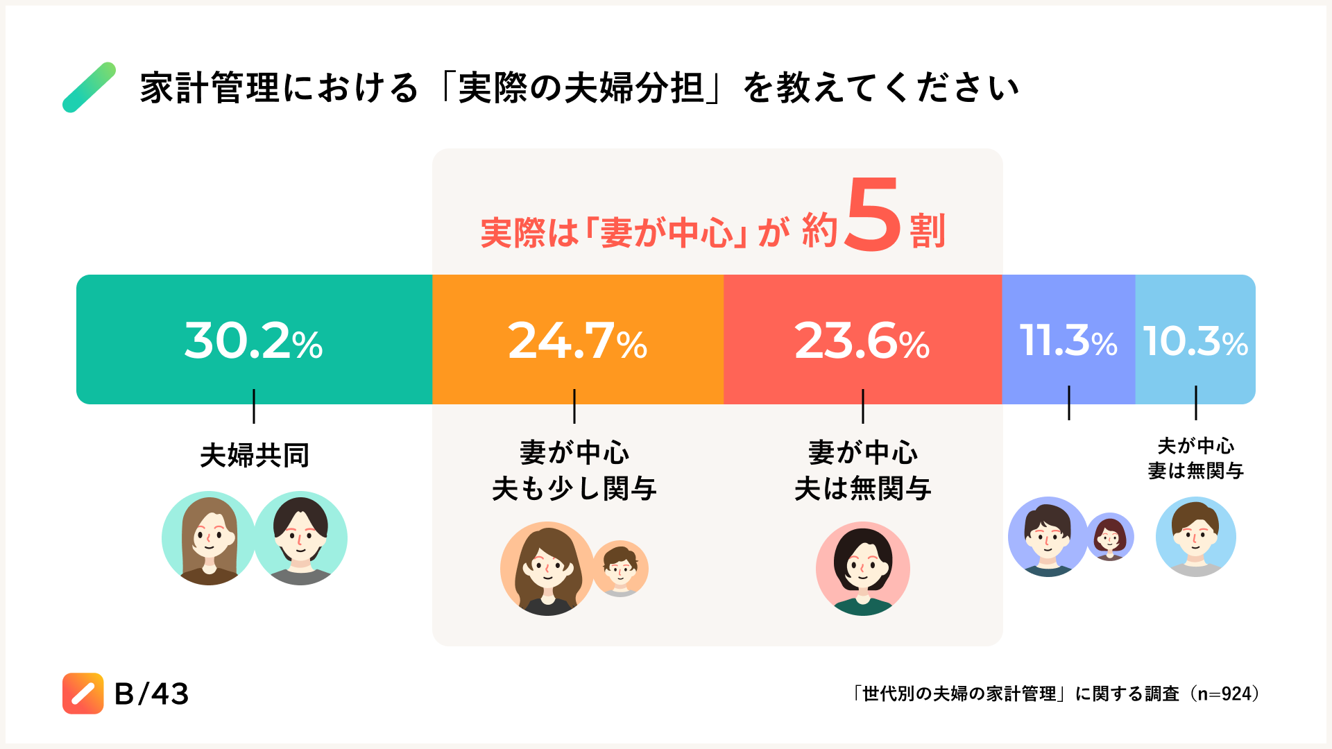実際の家計管理の夫婦分担は、「妻が中心」で行うパターンが最多