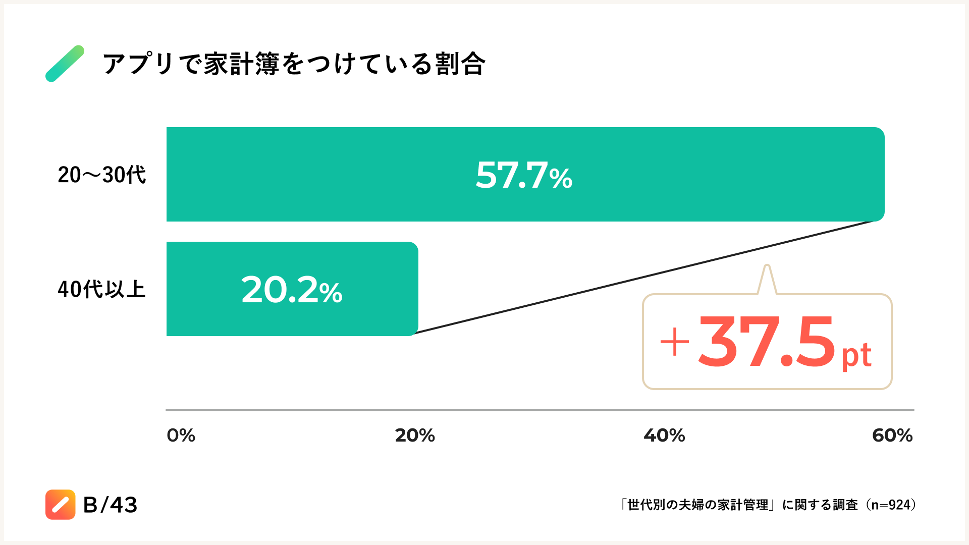 ~ アプリを活用して家計簿をつけている割合は、20代〜30代では57.7%、40代以上では20.2%となり、若い世代の方が37.5ポイント高い ~