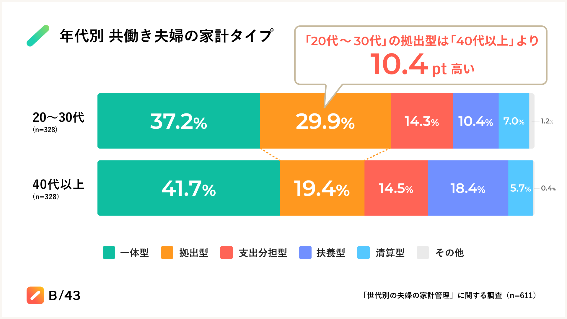 家計タイプを世代別にみると、世代差が最もあらわれるのは「拠出型」でした。20代〜30代では29.9%、40代以上では19.4%となり、若い世代の方が10.4ポイント高いことがわかりました。