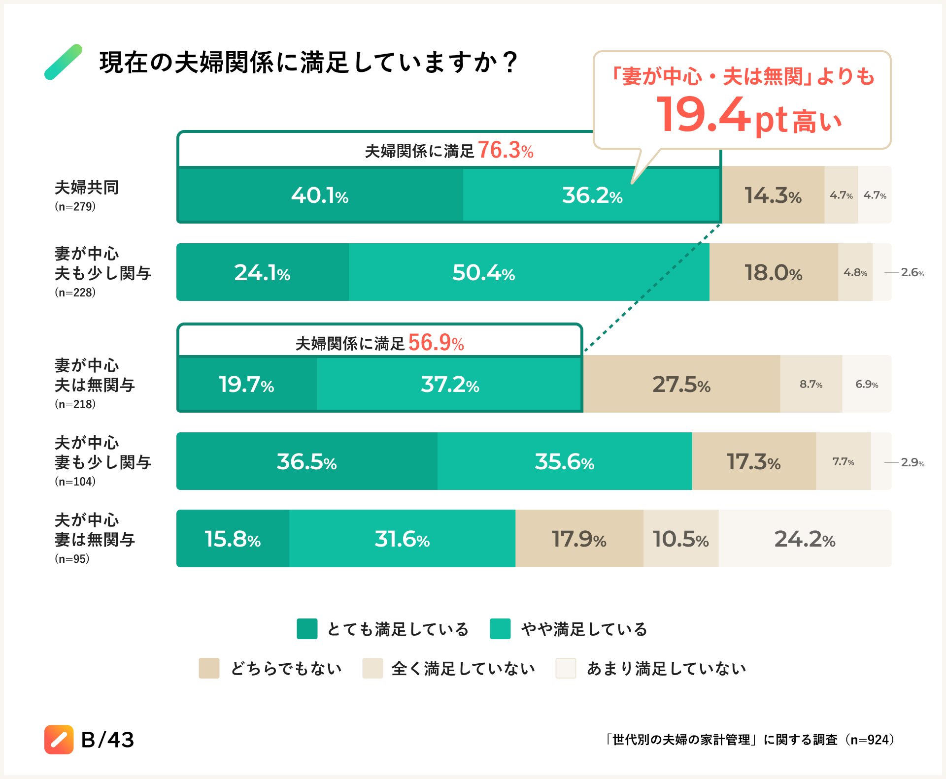 現在の夫婦関係に対する満足度を家計管理の夫婦分担別にみると、「夫婦関係に満足」と回答したのは「夫婦共同」で家計管理する夫婦では76.3%となりました。一方、「妻が中心・夫は無関与」で家計管理する夫婦は56.9%となり、「夫婦関係に満足」と回答する割合は「夫婦共同」で家計管理する夫婦の方が19.4ポイント高いことがわかりました。