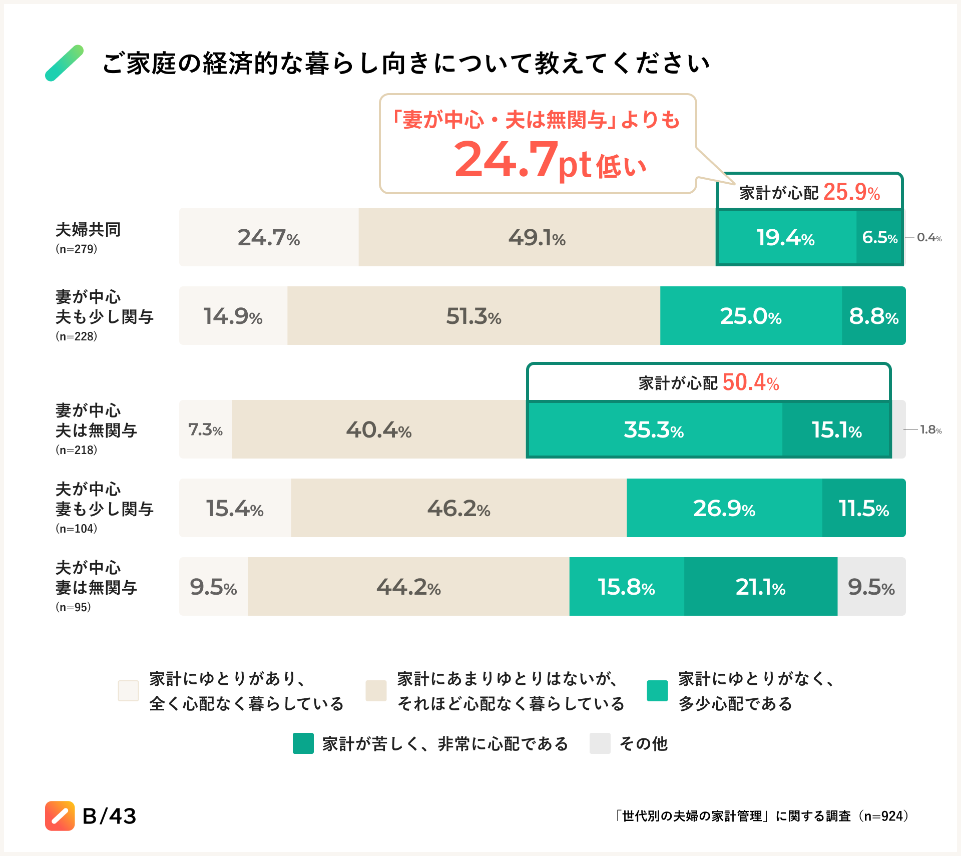 直近1年間における経済的な暮らし向きを家計管理の夫婦分担別にみると、「家計が心配」と回答したのは「夫婦共同」で家計管理する夫婦では25.8%となりました。一方、「妻が中心・夫は無関与」で家計管理する夫婦では50.5%となり、「家計が心配」と回答する割合は「夫婦共同」で家計管理する夫婦の方が24.7ポイント低いことがわかりました。