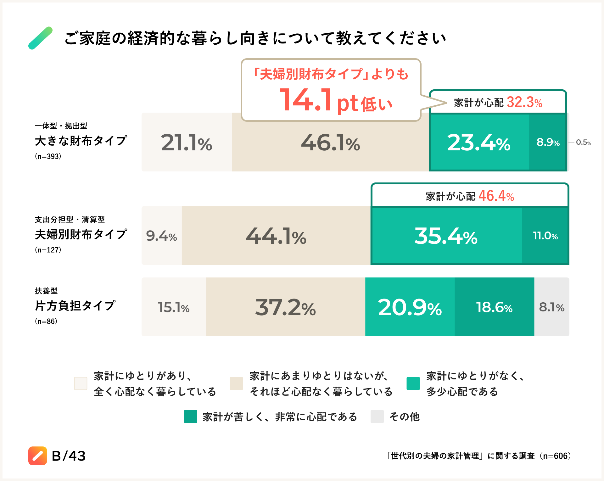 直近1年間における経済的な暮らし向きを、「収入持ち寄りタイプ」・「夫婦別財布タイプ」別にみると、「家計が心配」と回答したのは「収入持ち寄りタイプ」の夫婦では32.3%となりました。一方、「夫婦別財布タイプ」の夫婦では46.4%となり、「家計の心配」と回答する割合は「収入持ち寄りタイプ」の夫婦の方が14.1ポイント低いことがわかりました。