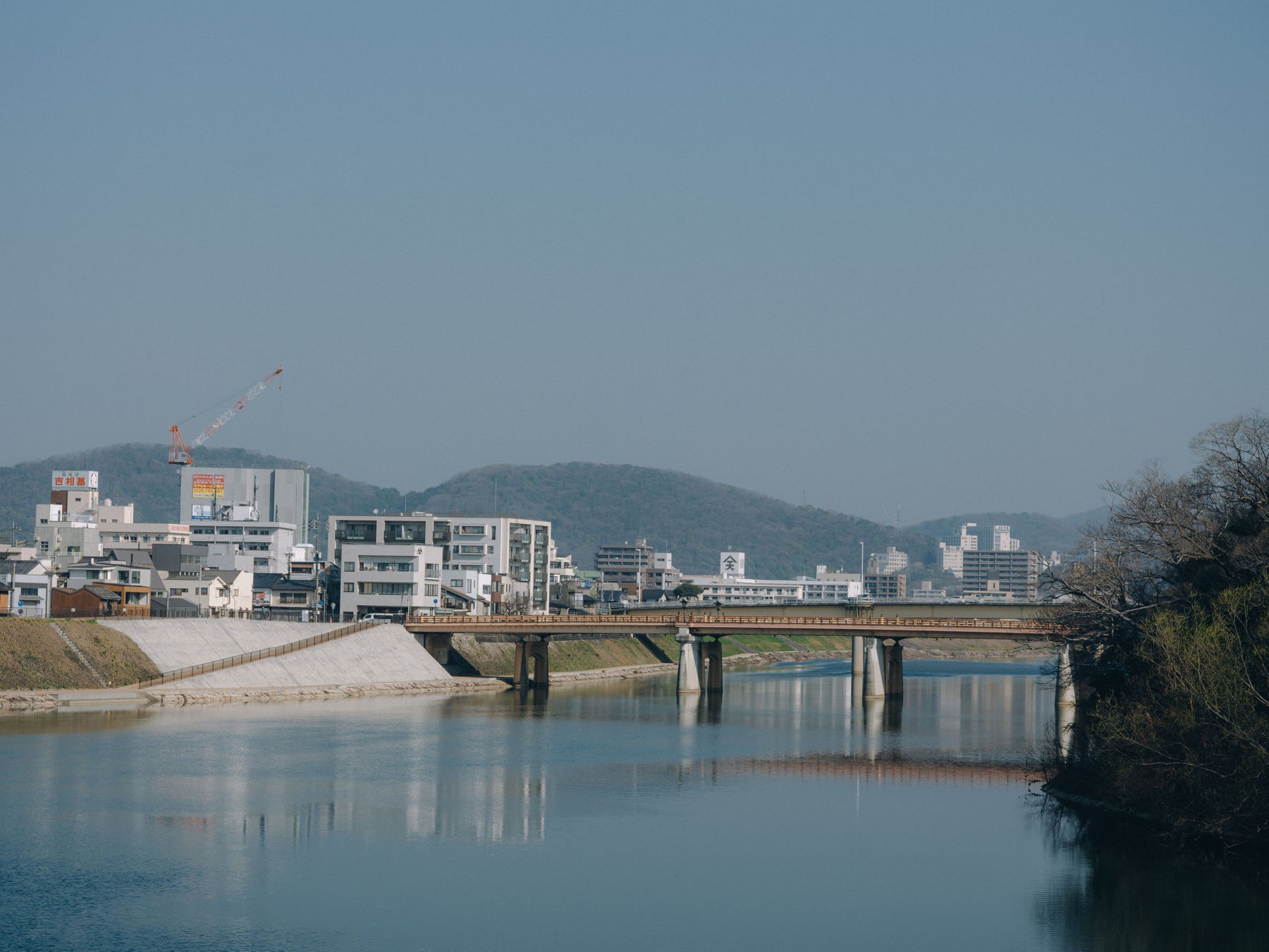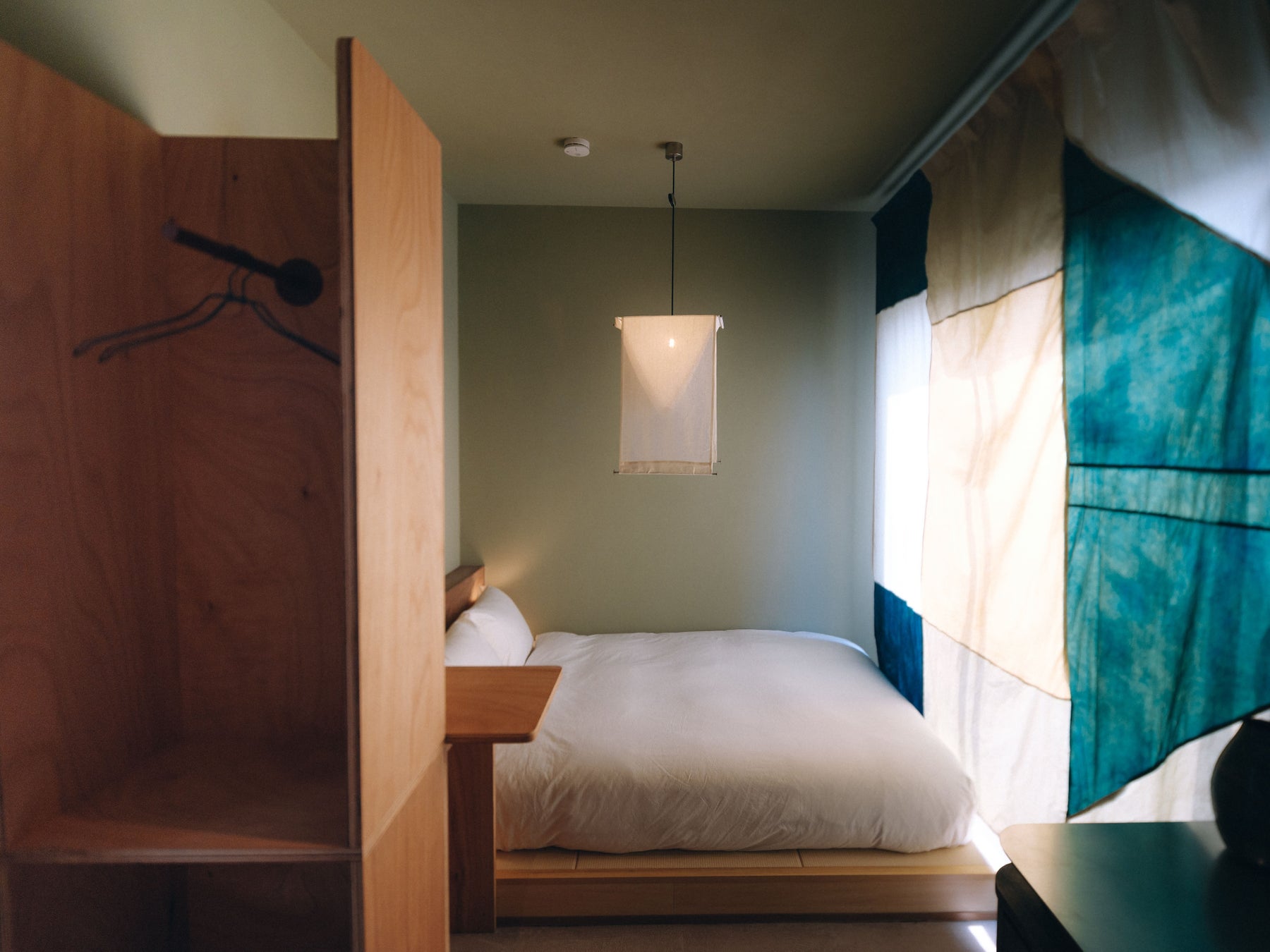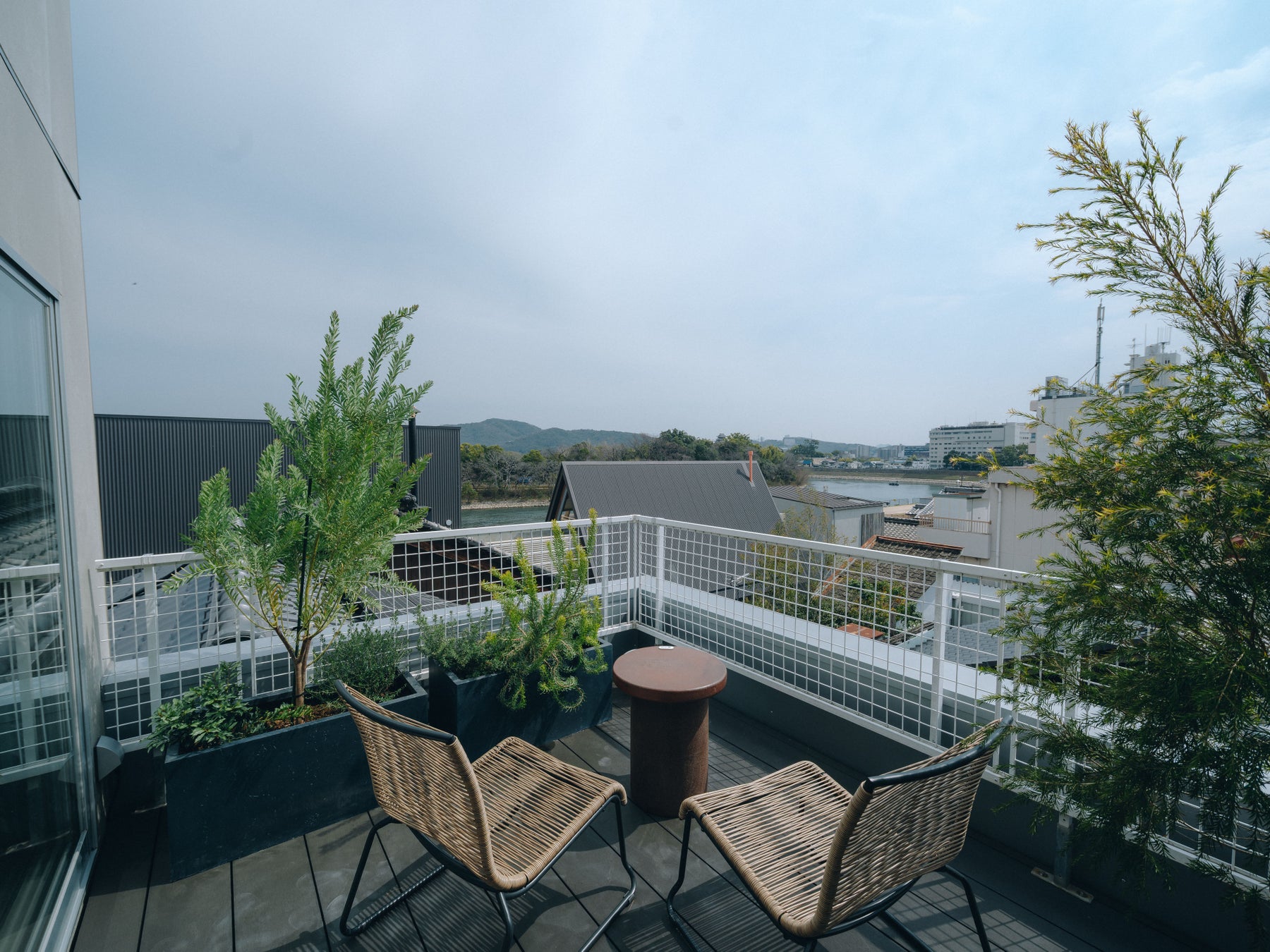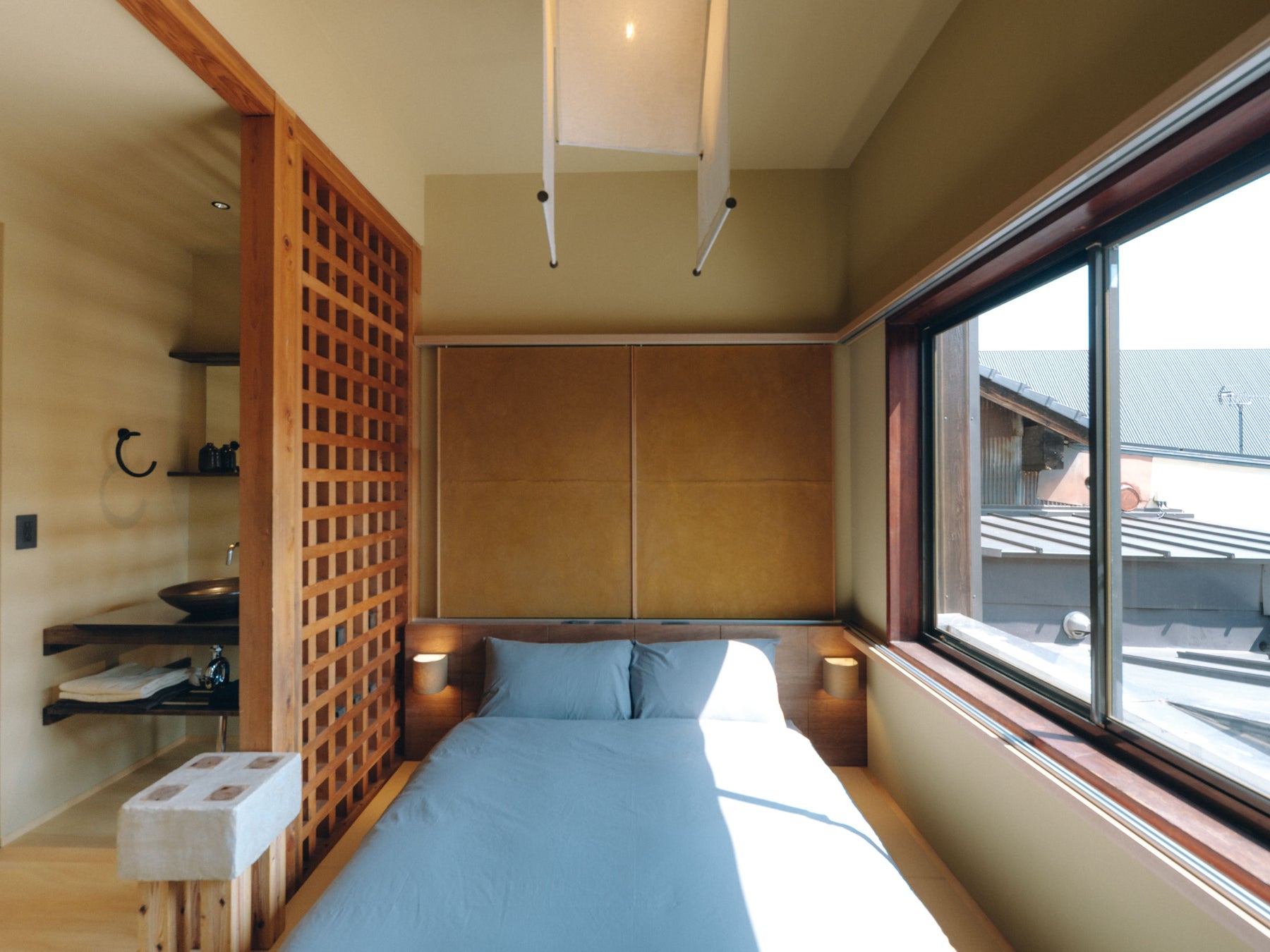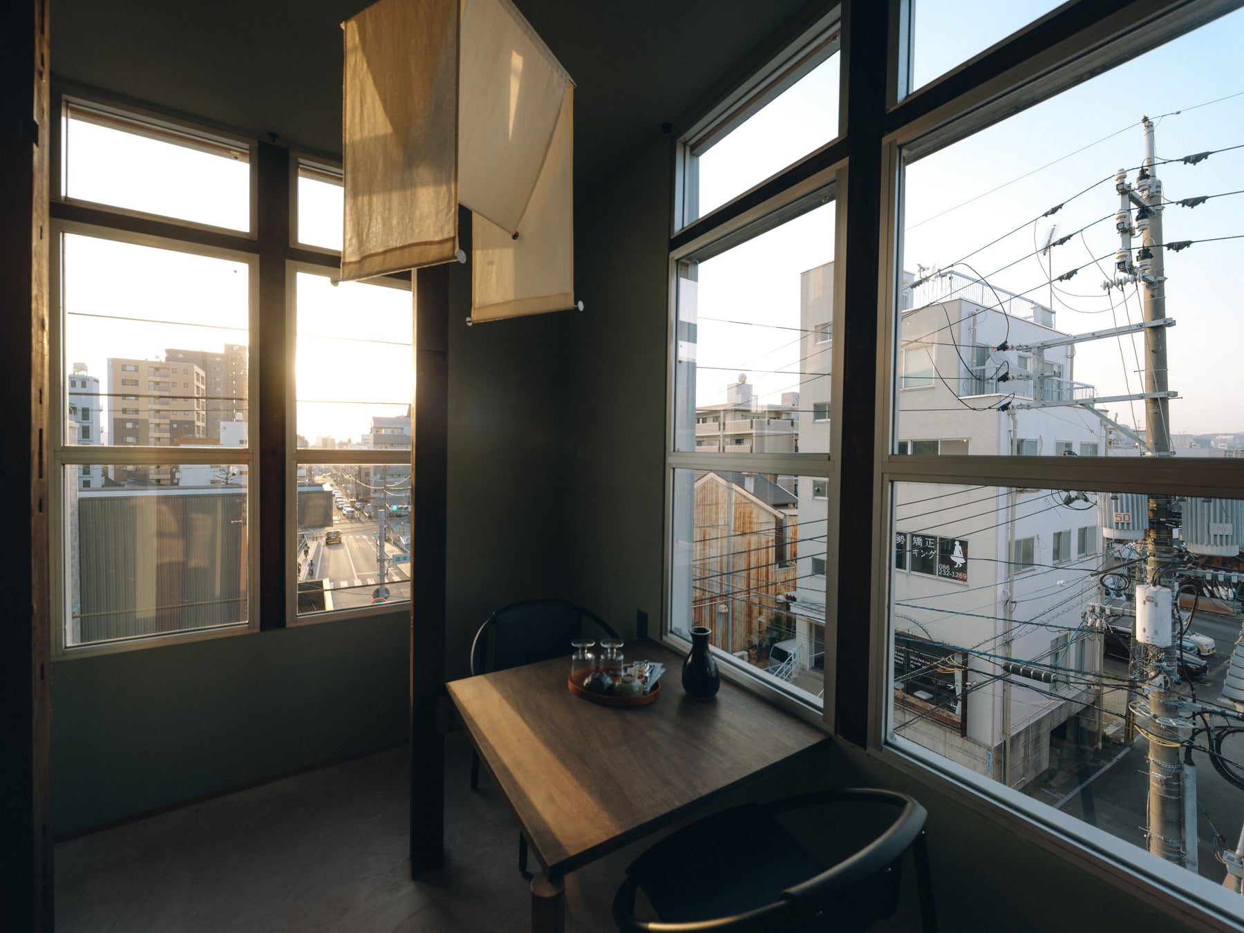 4室という限られた部屋数と、20平米に満たない小さな空間がもたらすのは、岡山の歴史を感じる構造の面白さ。格子状の壁や螺旋階段、木造の柱をそのまま活かしつつ、この建物がおよそ100年も見続けてきた旭川と後楽園の景色をモチーフにしたデザインに。また、各部屋には手作業で作られた三和土(たたき)を設け、温かみのある室内に仕上げています。