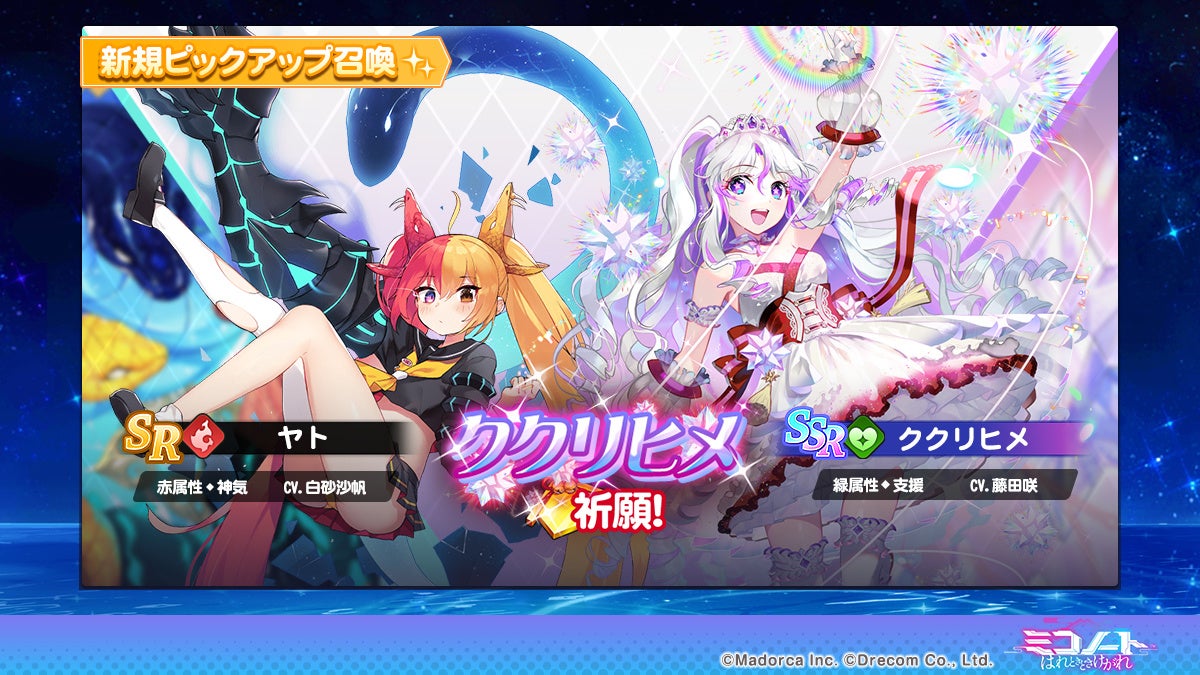 新たなSSRカミ「ククリヒメ(CV:藤田咲)」、SRカミ「ヤト(CV:白砂沙帆)」が登場!「ククリヒメ」、「ヤト」の登場を記念したピックアップ召喚を開催します。