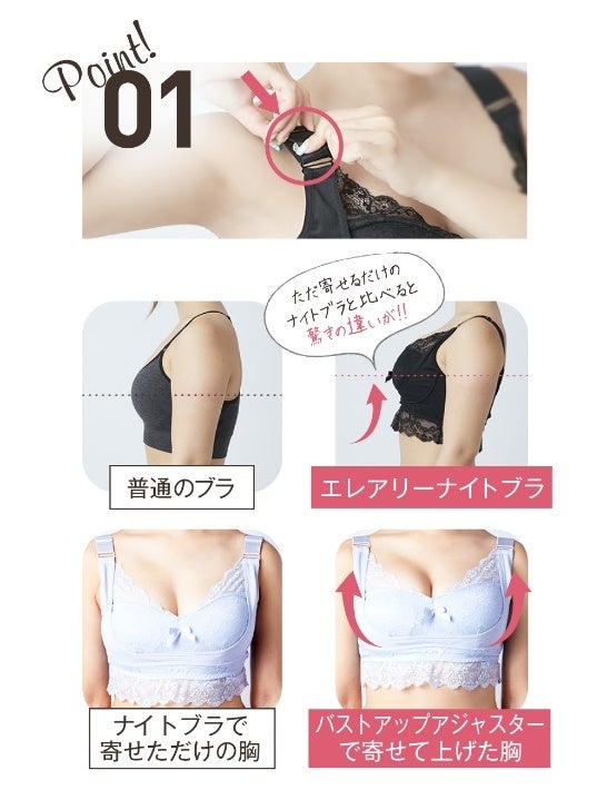 エレアリーナイトブラは、他のナイトブラにはないアジャスター付きで、どんなバストのお悩みもマルチにサポートできるという強みがあります。そして【機能性・着け心地・デザイン性】の全てにこだわったナイトブラです。