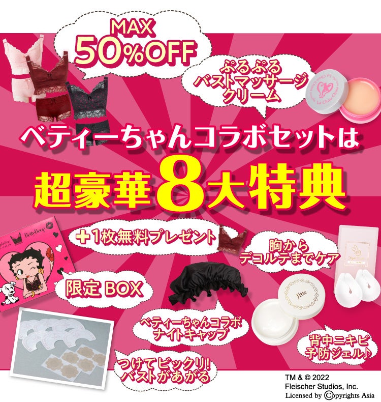 大人気だった第1弾からグレードアップし、第2弾ではベティーちゃんに変身できる可愛い“ヘアキャップ”や“バストケアクリーム”など、超豪華8大特典で女性のボディケアをサポートいたします。