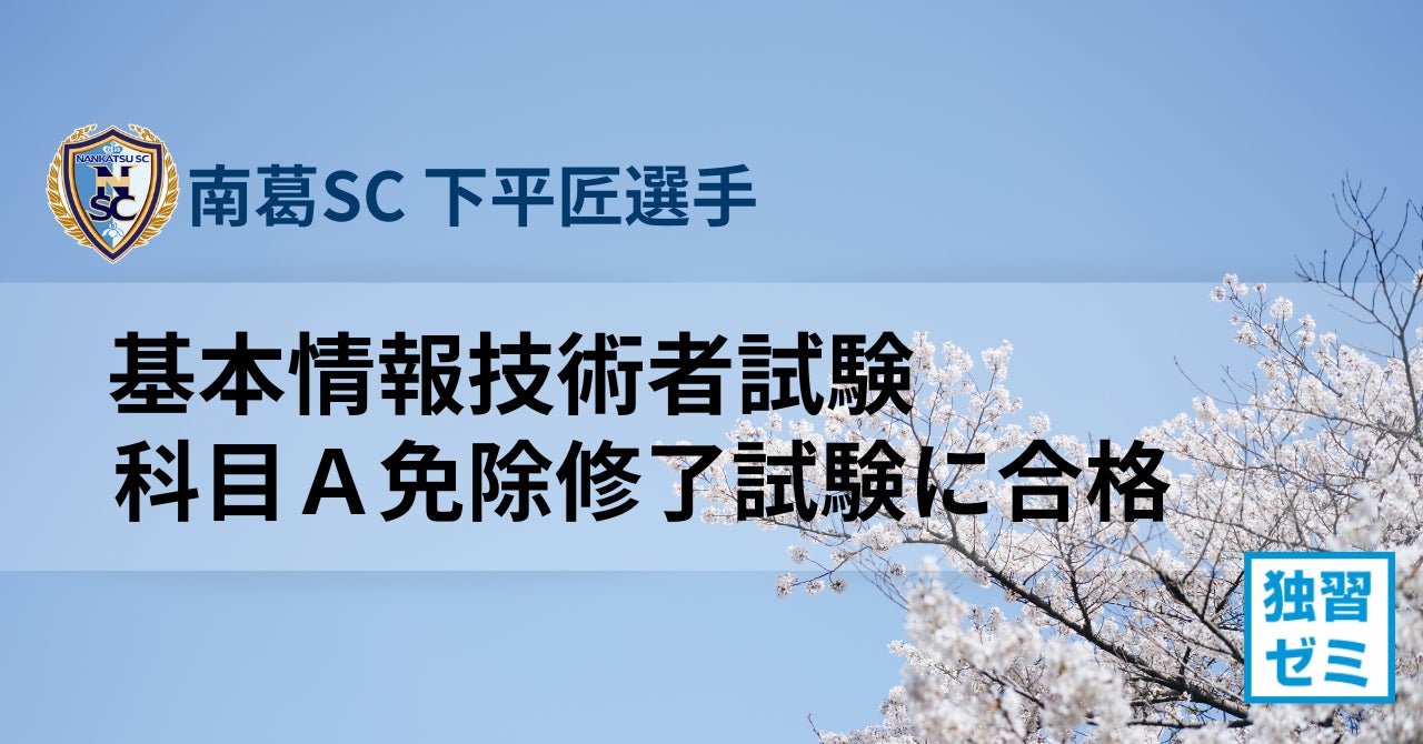 南葛SC下平匠選手が基本情報技術者試験 科目A免除修了試験に合格!