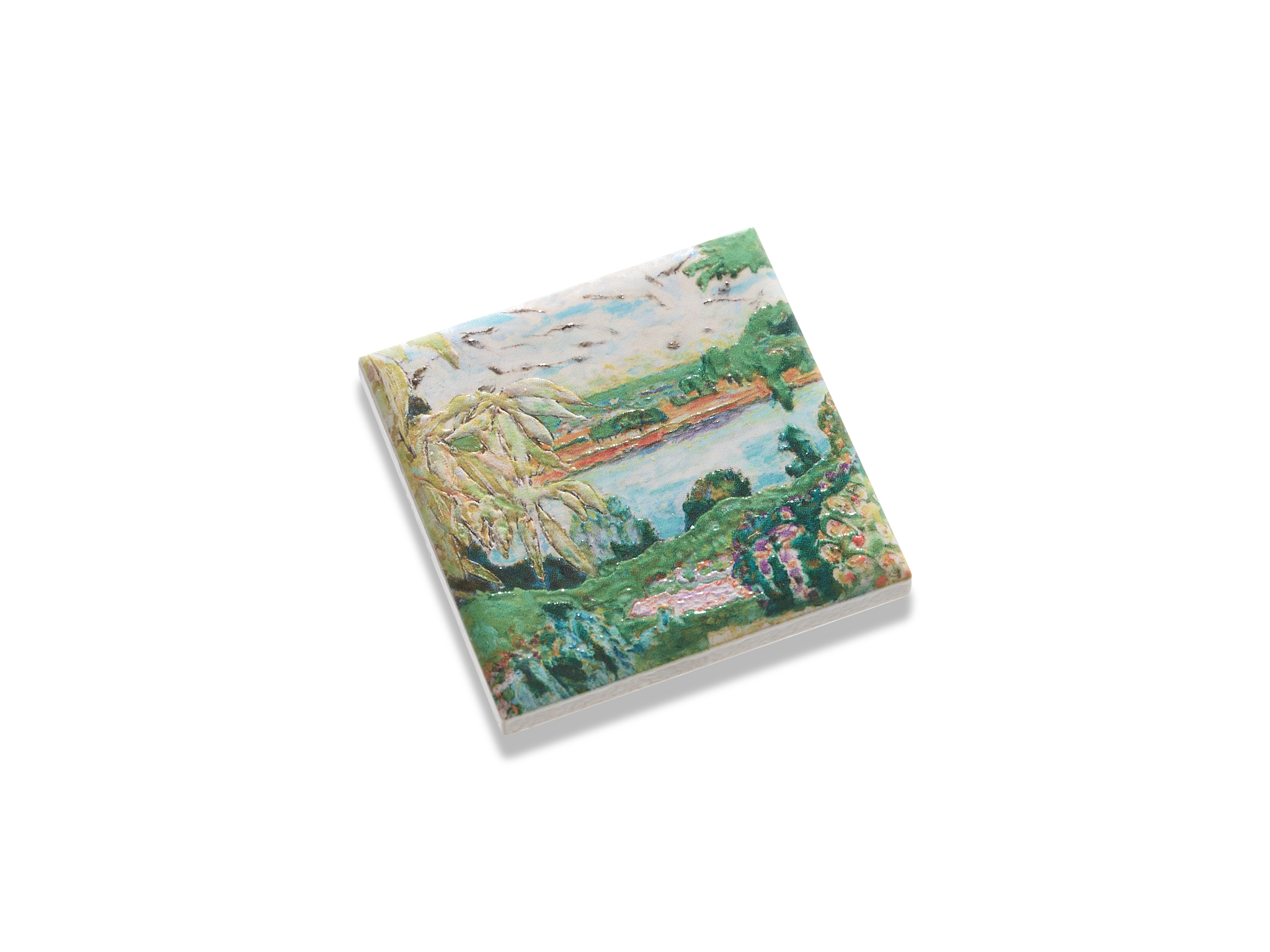 モネと親交のあったボナールが、フランスの自宅の近くで見た風景を描いた作品です。ユニークな画面構成を強調するため、遠景に広がる空とセーヌ川の水面はあえてフラットにしており、四辺を縁取るように描かれている手前の植物たちには高低差のある凹凸をつけてメリハリを出しています。まるで絵の中に入り込んだような錯覚を覚える、ボナールの世界に没入できるアイテムです。