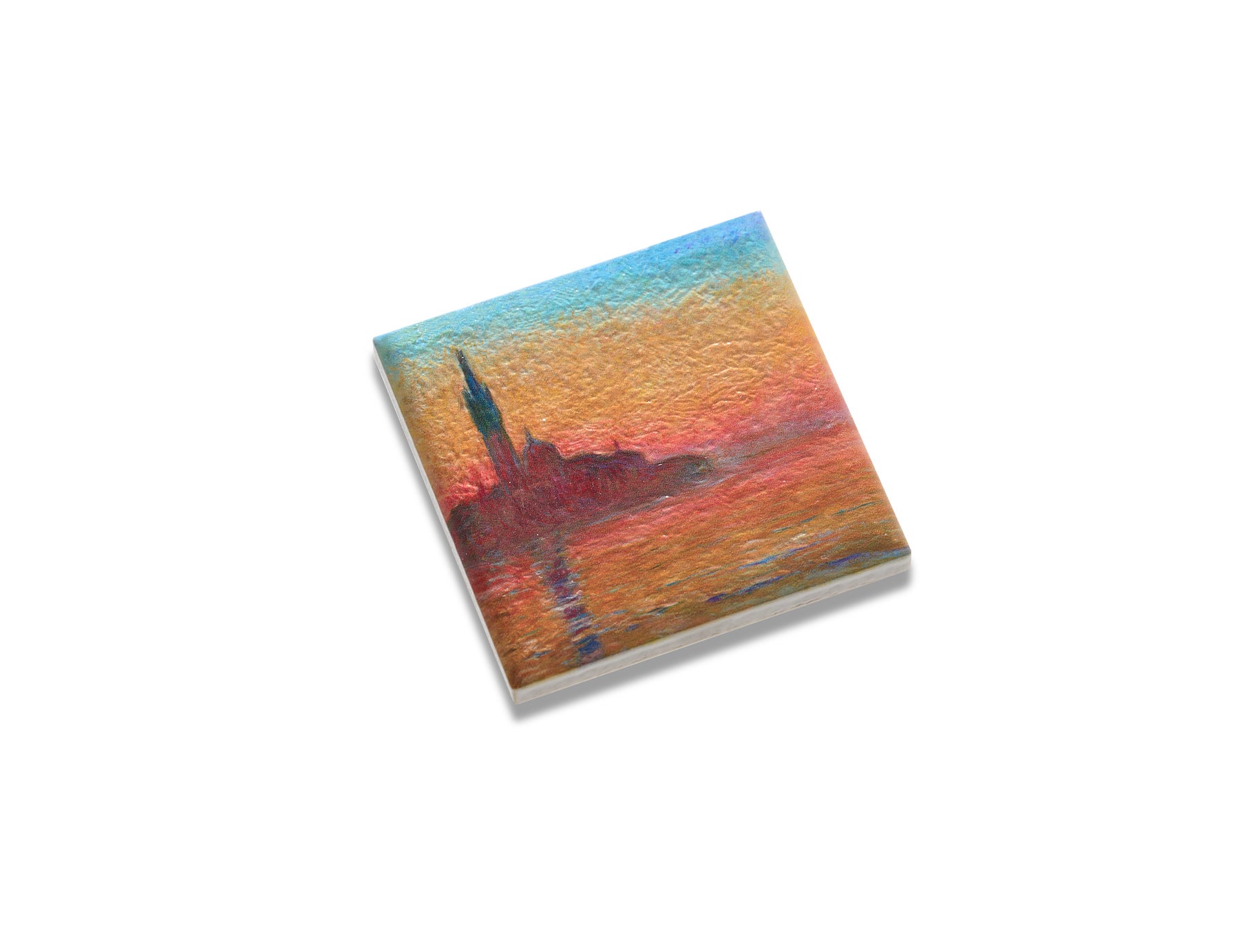 モネが晩年に訪れたヴェネツィアの美しい夕暮れの風景を描いた作品です。水面や建物に反射している美しい黄昏のグラデーションを再現するため、うねるように表現された空と、波の動きを感じる水面の描写には異なるテクスチャの凹凸をつけて、原画の溶け込むような美しいグラデーションを再現しています。モネらしい豊かな色彩の重なりを指先で感じていただけます。