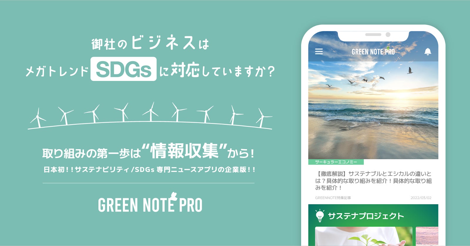 自治体、企業としても社員個人としても、サステナビリティやSDGsに対応していくために最初に必要な事は”情報収集”です。「GREEN NOTE PRO」は、益々重要となってくるサステナビリティ / SDGsに関する取り組みを強化していきたい自治体様・企業様のニーズに合わせ、サステナビリティ最新情報やオリジナルコンテンツなどを提供する企業向けプランです。