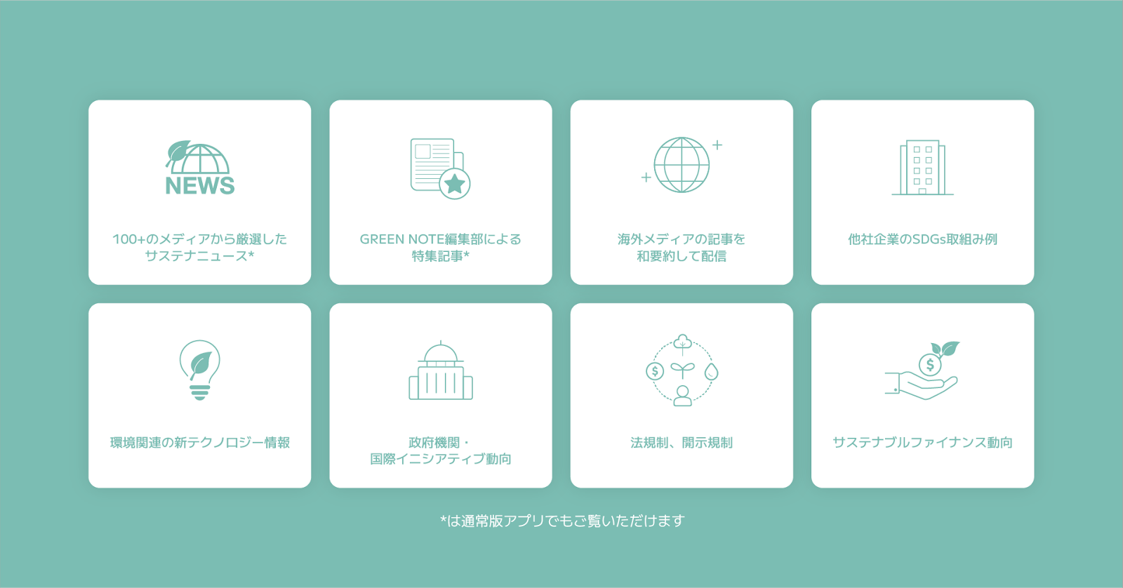 「GREEN NOTE PRO」では、パーソナライズされた国内のニュース配信に加え、ここでしか読めない海外最新動向や国内外の事例なども掲載しています。