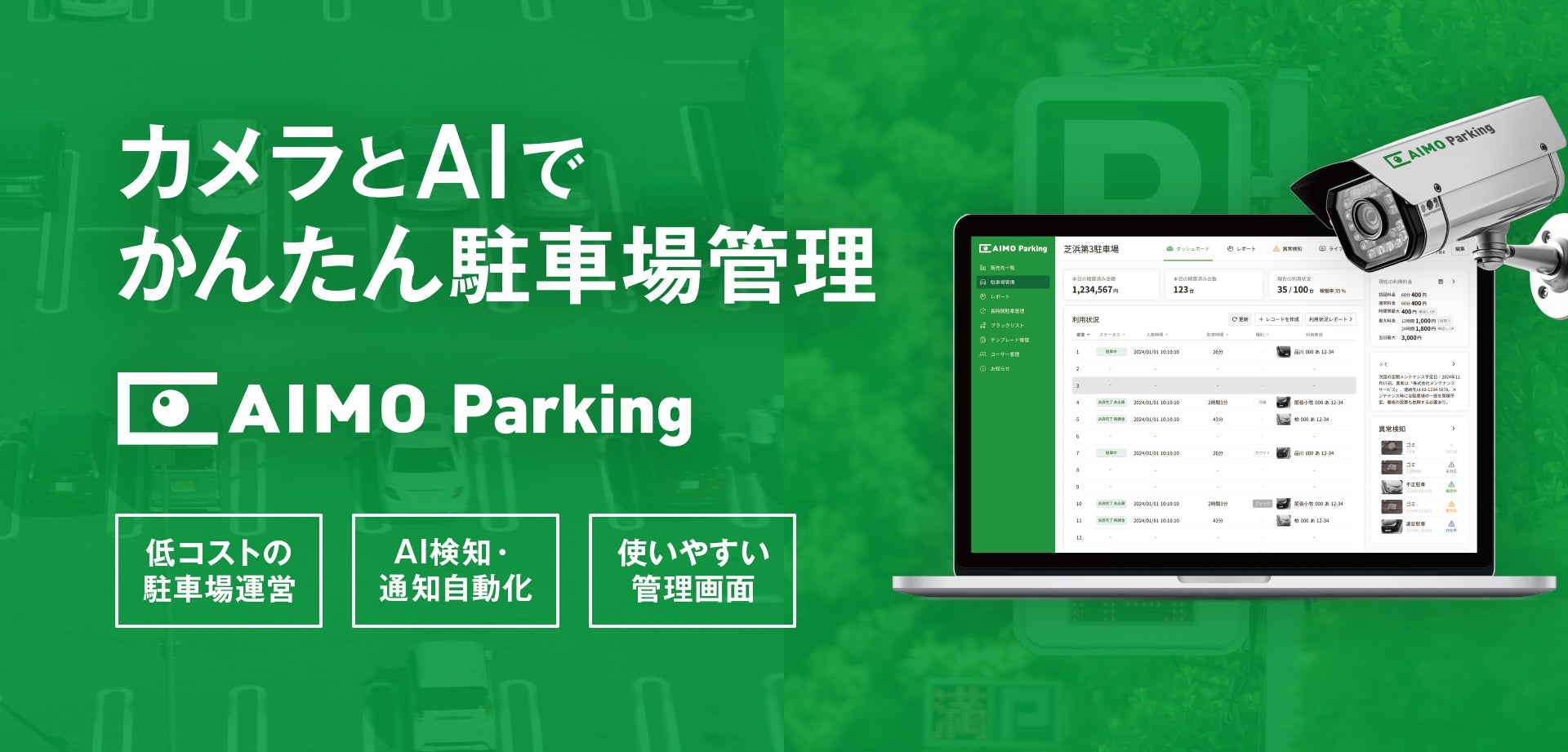 AIカメラで簡単駐車場管理サービス「AIMO Parking」:https://aimo-sys.com/parking.html