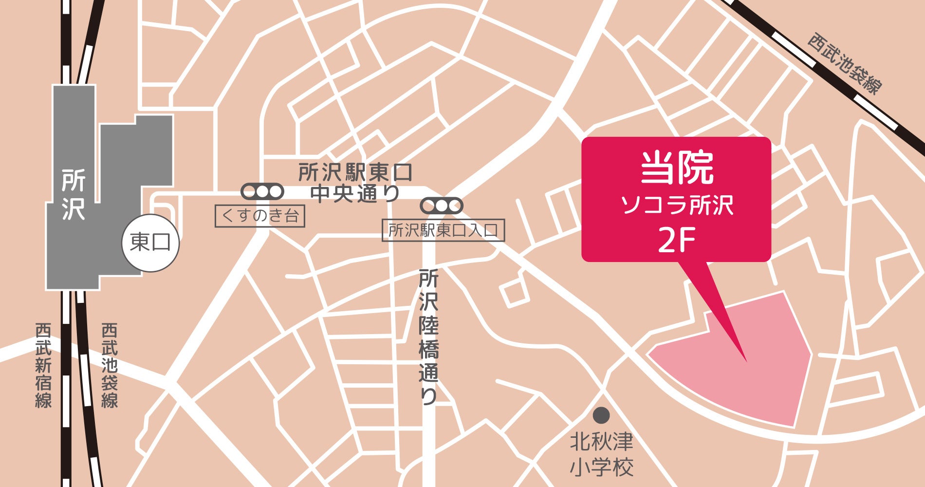 西武新宿線、西武池袋線「所沢駅」駅東口徒歩約11分の「SOCOLA(ソコラ)所沢」2階で、朝9時から夜21時まで、土日祝日も毎日診療を行います。