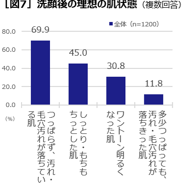 - 洗顔後の理想の肌は「つっぱらず、汚れ・毛穴汚れが落ちている肌」