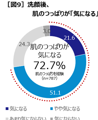 そこで洗顔後の肌のつっぱりについて聞くと、65.6%が肌のつっぱりを感じ(感じる20.7%+たまに感じる44.9%)[図8]、そのうちの72.7%が肌のつっぱりが「気になる」(気になる21.6%+やや気になる51.1%)と回答[図9]。理想の肌と現実のギャップが感じられる結果となりました。