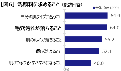 また、洗顔料に求めることを聞くと、「自分の肌タイプに合うこと」(64.9%)と並んで、「毛穴汚れが落ちること」(64.0%)が高く、洗顔料で毛穴ケアができることへの期待の高さがうかがえます[図6]。