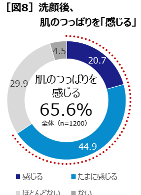 - しかし、65%が洗顔後の肌のつっぱりを感じ、うち7割が洗顔後の肌のつっぱりが気になる