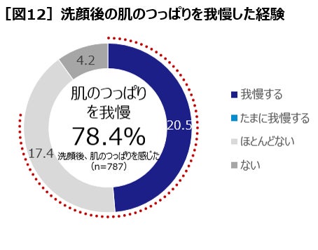 前述図8で「洗顔後の肌のつっぱりを感じた」と答えた方に、肌のつっぱりを感じても我慢した経験があるかと聞いたところ、実に78.4%が「我慢することがある」(我慢する20.5%+たまに我慢する57.9%)と答えました[図12]。