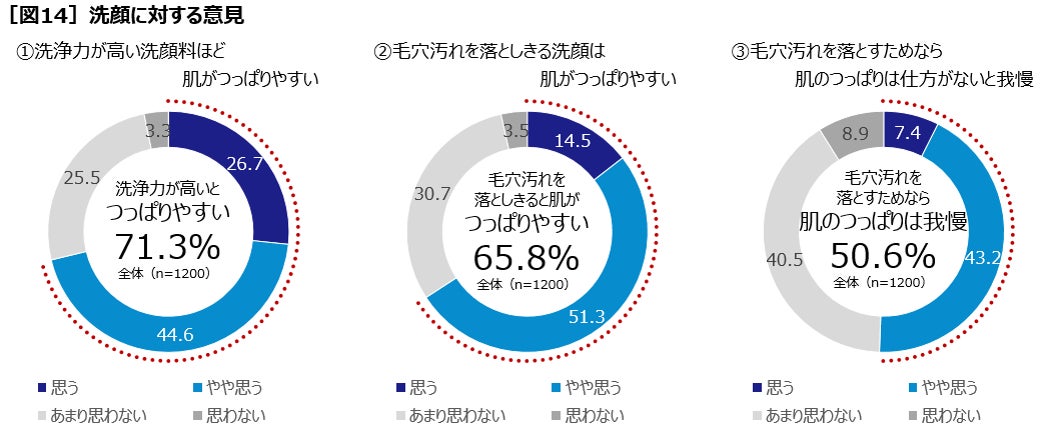 洗顔後、肌につっぱりを感じても、洗ったという感覚が得られ、また、毛穴汚れがしっかり落ちている感じがするから、としっかり洗い上げることを重視し、半面「肌のつっぱり」は仕方ないとあきらめることも少なくないということが明らかになりました。