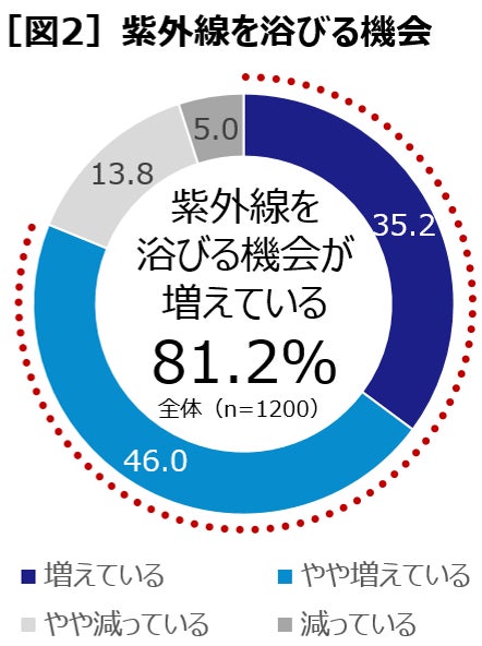 また、81.2%が「昨年に比べ紫外線を浴びる機会が増えている」(増えている35.2%+やや増えている46.0%)と答えました[図2]。
