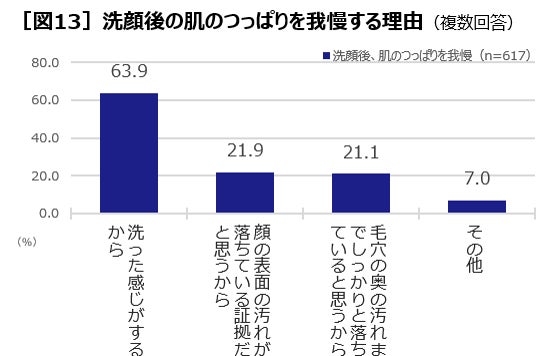 また「我慢する」理由については、6割が「洗った感じがするから」(63.9%)、2割が「毛穴の奥の汚れまでしっかりと落ちていると思うから」(21.1%)と回答[図13]。