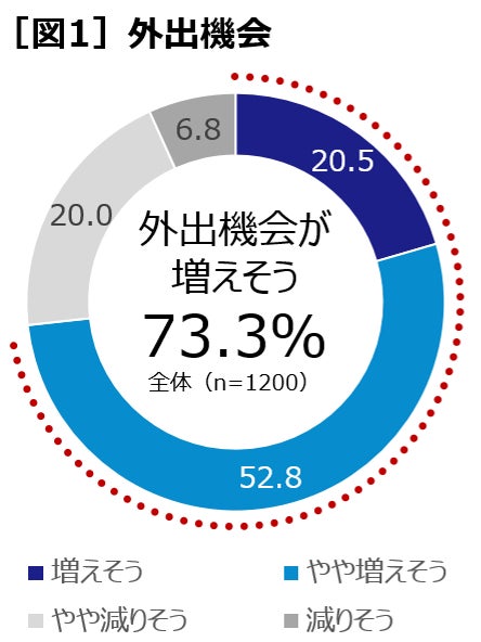 まず、2022年の夏と21年の夏を比較すると、73.3%が「外出する機会が増えそう」(増えそう20.5%+やや増えそう52.8%)と回答[図1]。