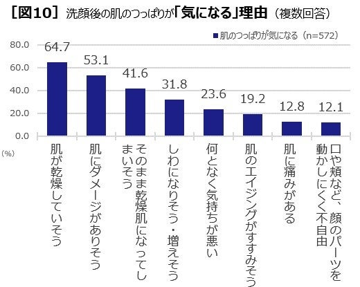 洗顔後の「肌のつっぱりが気になる」と答えた方の気になる理由を確認したところ、「肌が乾燥していそう」(64.7%)が最も多く、「肌にダメージがありそう」(53.1%)、「そのまま乾燥肌になってしまいそう」(41.6%)、「しわになりそう」(31.8%)が挙げられました[図10]。生活者の皆さんにとって、洗顔後の肌のつっぱりは、肌の乾燥サインとしても認知されているようです。