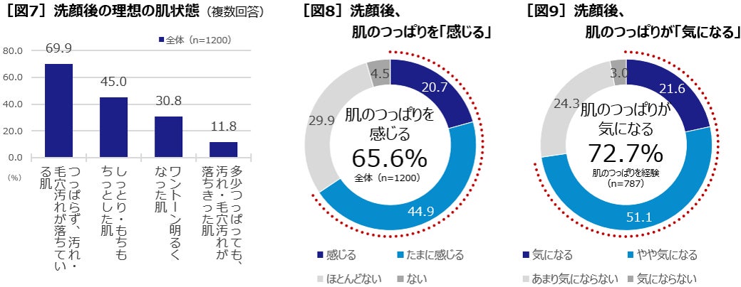 ・洗顔後の理想は「つっぱらず、毛穴汚れが落ちている肌」(69.9%)。しかし、65.6%が洗顔後の肌のつっぱりを感じ、そのうち約7割に肌のつっぱりが気になるとの声。その理由として「肌が乾燥していそう」(64.7%)と肌への負担を気にする方も。