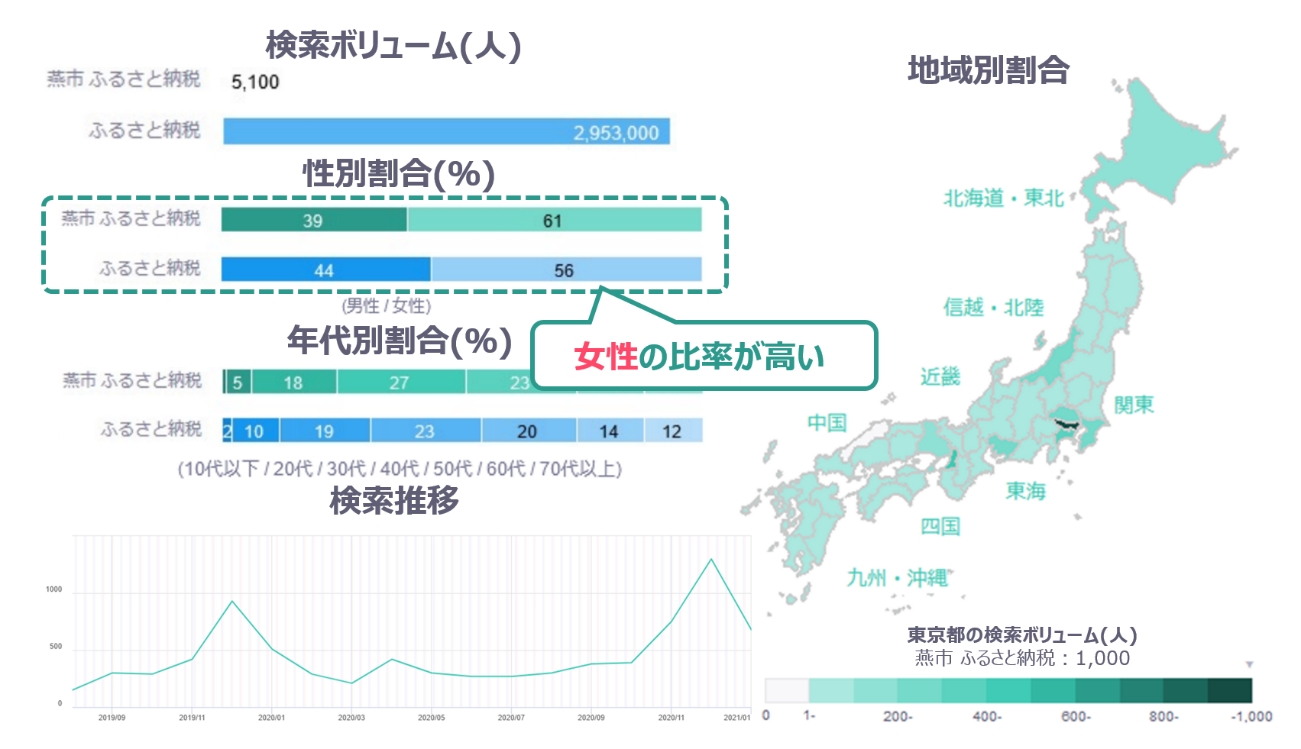 燕市では、ふるさと納税を通じて地域の魅力を発信していくことを主な目的として、「DS.ANALYSIS」を導入いただきました。燕市が把握しているふるさと納税申込者のデータでは男女比率がほぼ半々の一方で、女性からの問い合わせが多い状況がありました。市による、“関心を持つ人の割合は女性の方が多いのではないか”という仮説に対し、検索データでも裏付けができるなど、データに基づくプロモーション戦略や返礼品選定の道筋をつけることができました。