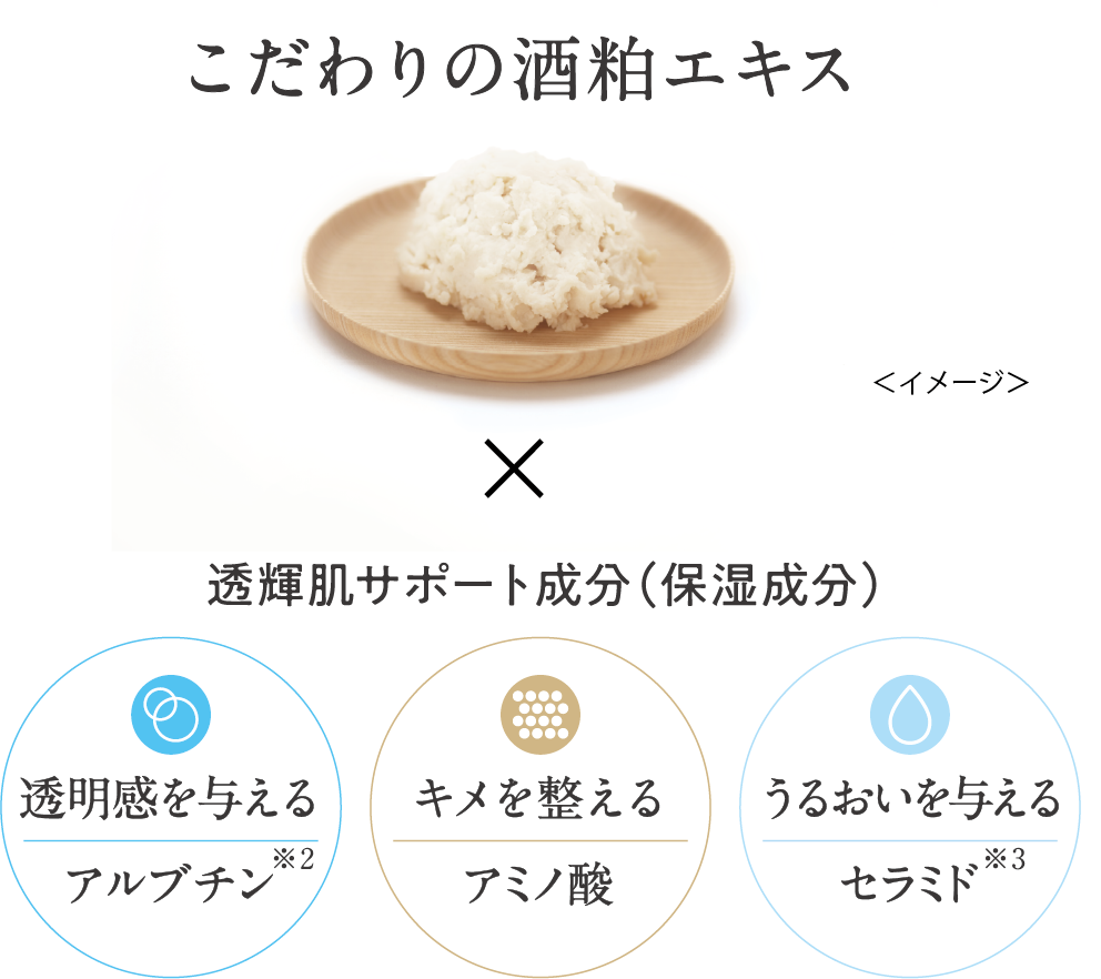 熊本県 河津酒造の「純米吟醸 花雪」の酒粕から抽出したオリジナルの酒粕エキスと、透明感を与える保湿成分「アルブチン」、キメを整える「アミノ酸」、うるおいを与える「セラミド※3」の