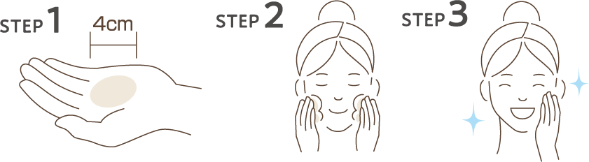 ・使用方法:さくらんぼ大(4㎝)程度を手に取り、目や口の周りを避けて塗り広げ、1分間やさしくマッサージをし、水またはぬるま湯でよく洗い流してください
