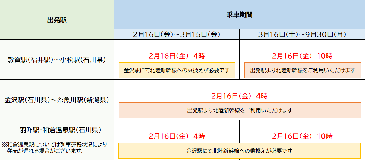 これまでご利用いただけなかった糸魚川駅(新潟県)以西の北陸エリア各駅出発商品の販売を下記日時に開始します。