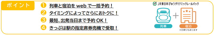 「JR東日本びゅうダイナミックレールパック」は、取扱エリア内の新幹線・特急列車と宿泊施設もしくは観光施設等(日帰り旅行のみ可能)を組み合わせたweb販売限定の価格変動型旅行商品です。
