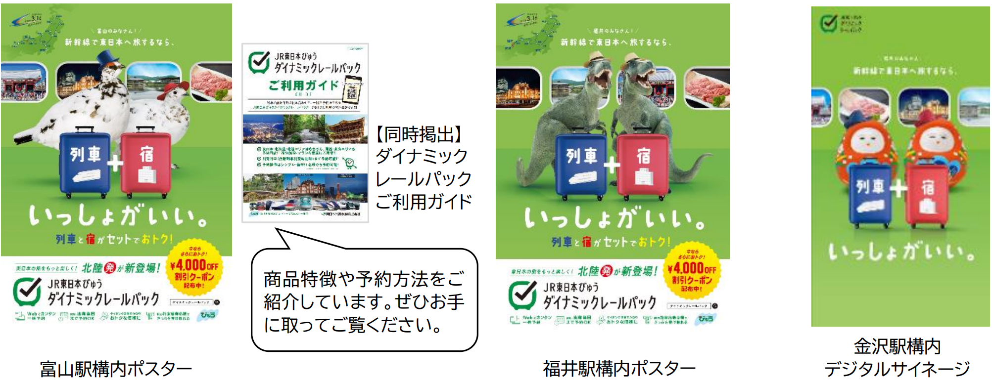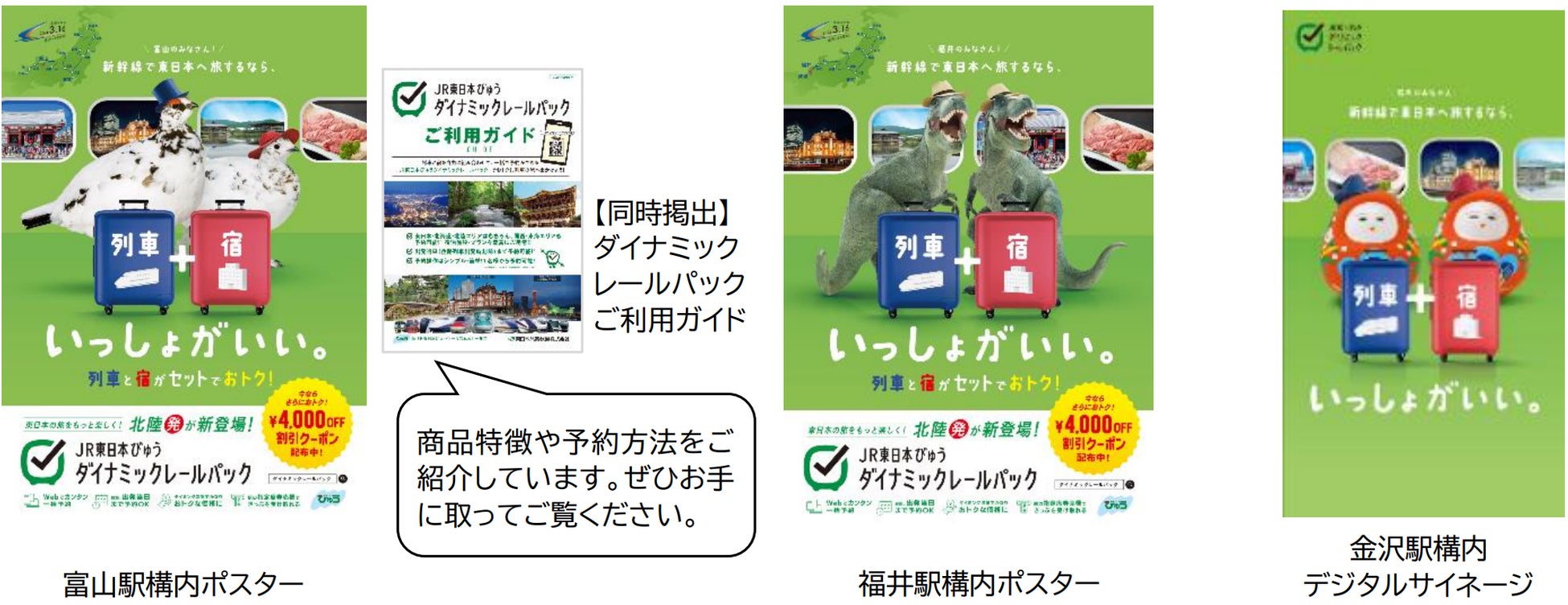 ダイナミックレールパックが北陸からのご旅行にもご利用いただけるようになることに伴い、富山県・石川県・福井県にてテレビCMや駅構内広告等で2~3月を中心に各種宣伝プロモーションを実施します。北陸3県に縁のあるキャラクターが東日本エリアへのおトクで便利な列車の旅をPRします。