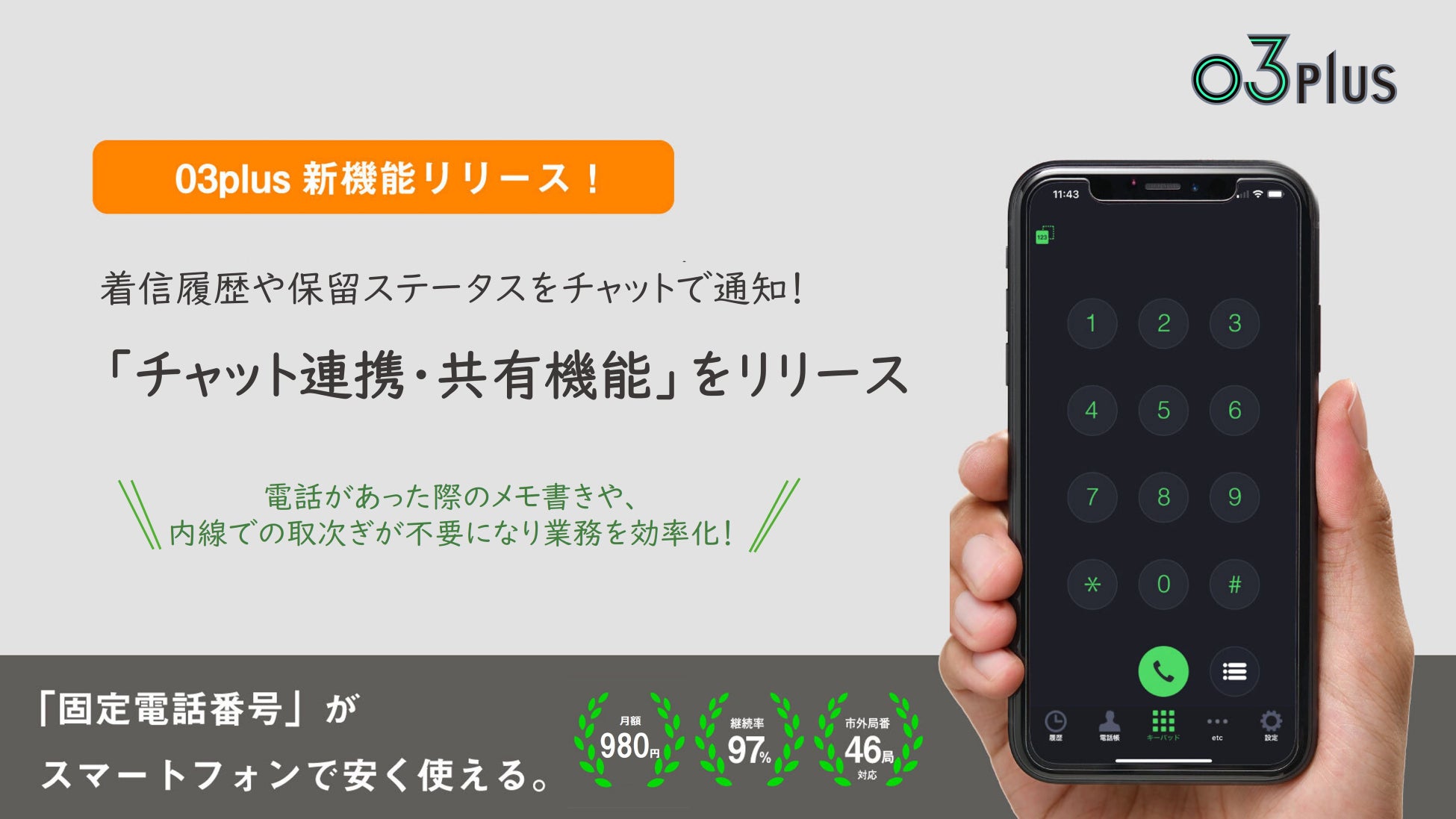 回線工事不要のクラウドPBX「03plus」、着信履歴や電話保留中のステータスをチャットで共有できる「チャット連携・共有機能」の提供を開始