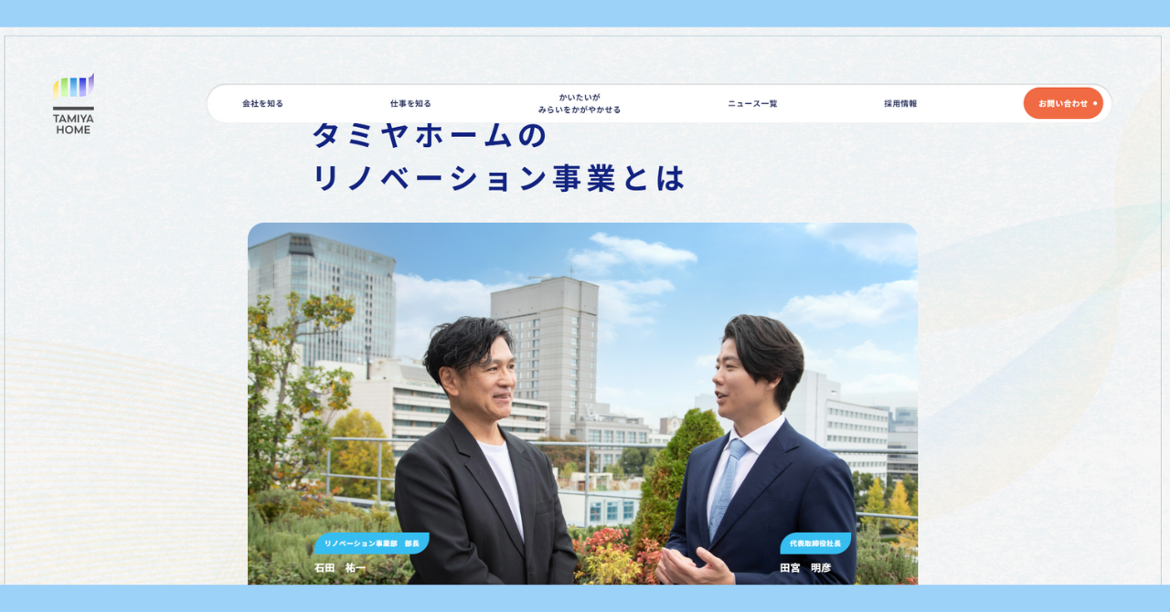「かいたいが みらいを かがやかせる」を合言葉に一都三県を中心に解体工事業を展開する株式会社タミヤホーム(本社:埼玉県所沢市、営業本部:東京都千代田区永田町、代表取締役社長:田宮 明彦)は、2025年11月1日より本格始動した「リノベーション事業」について、この度、専用Webページを開設し、あわせて経営層および営業部門による対談記事を複数公開しましたことをお知らせいたします。